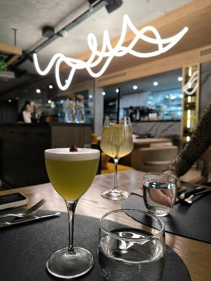 Two cocktails and water glasses sit on a table, under a modern lighting fixture. The first cocktail, a light green color with a frothy top and garnish, is in a stemmed glass. The second cocktail, ligh…read more