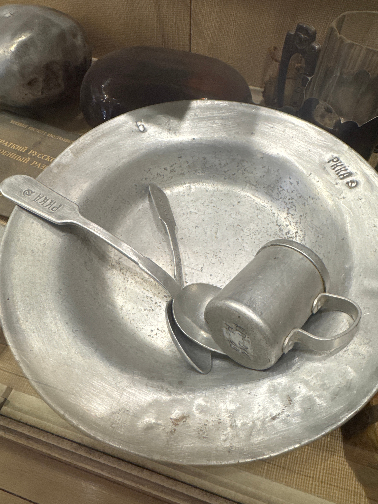 The image shows a collection of metallic eating utensils, likely an exhibit in a museum. A shallow, round plate made of a dull silver metal dominates the scene. The letters "PKKA" are stamped near the…read more
