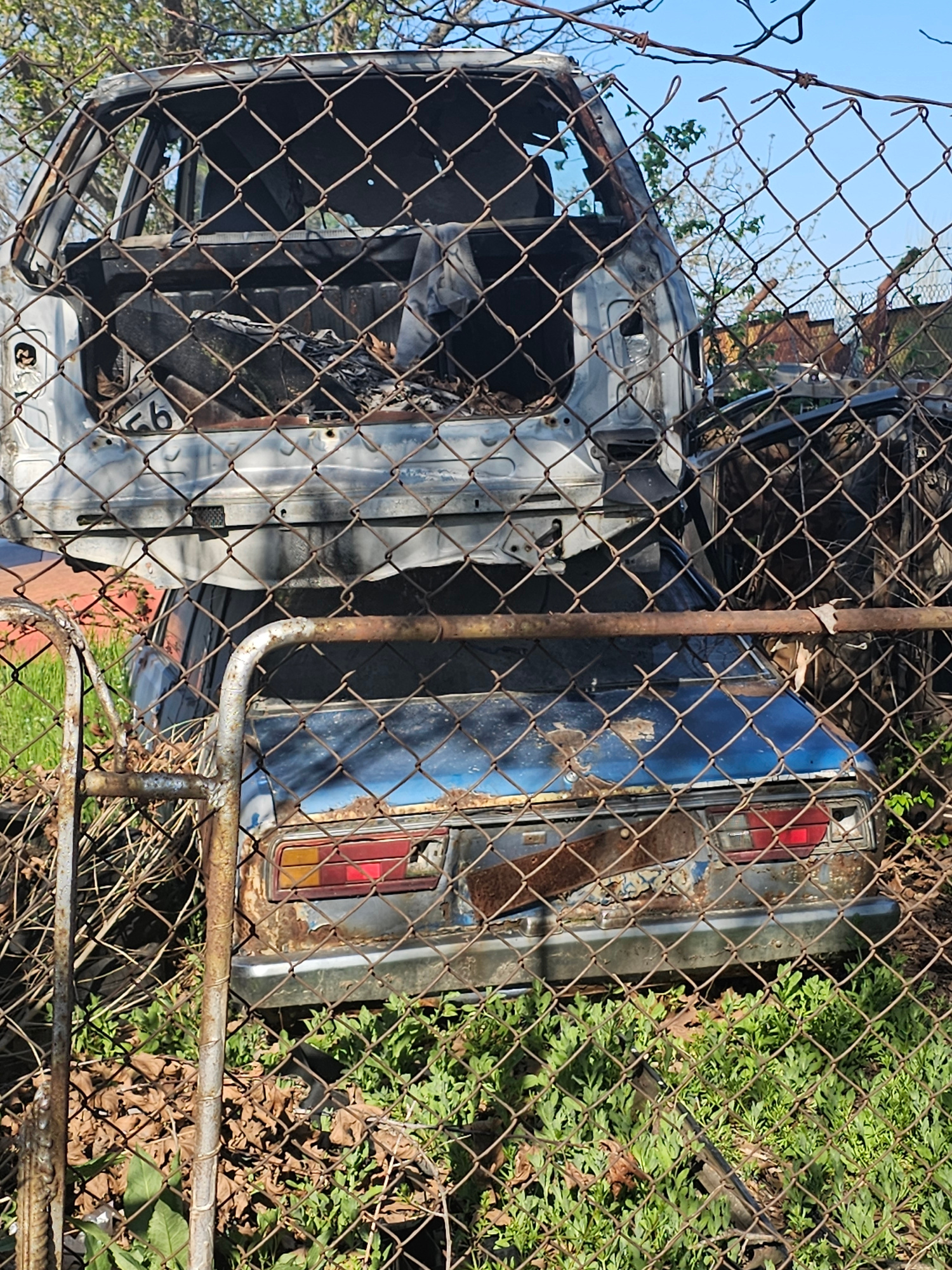 The image depicts two dilapidated cars, visible through a chain-link fence. The car on the left is a heavily damaged, light-colored frame, stripped of most components. The car on the right is blue, wi…read more