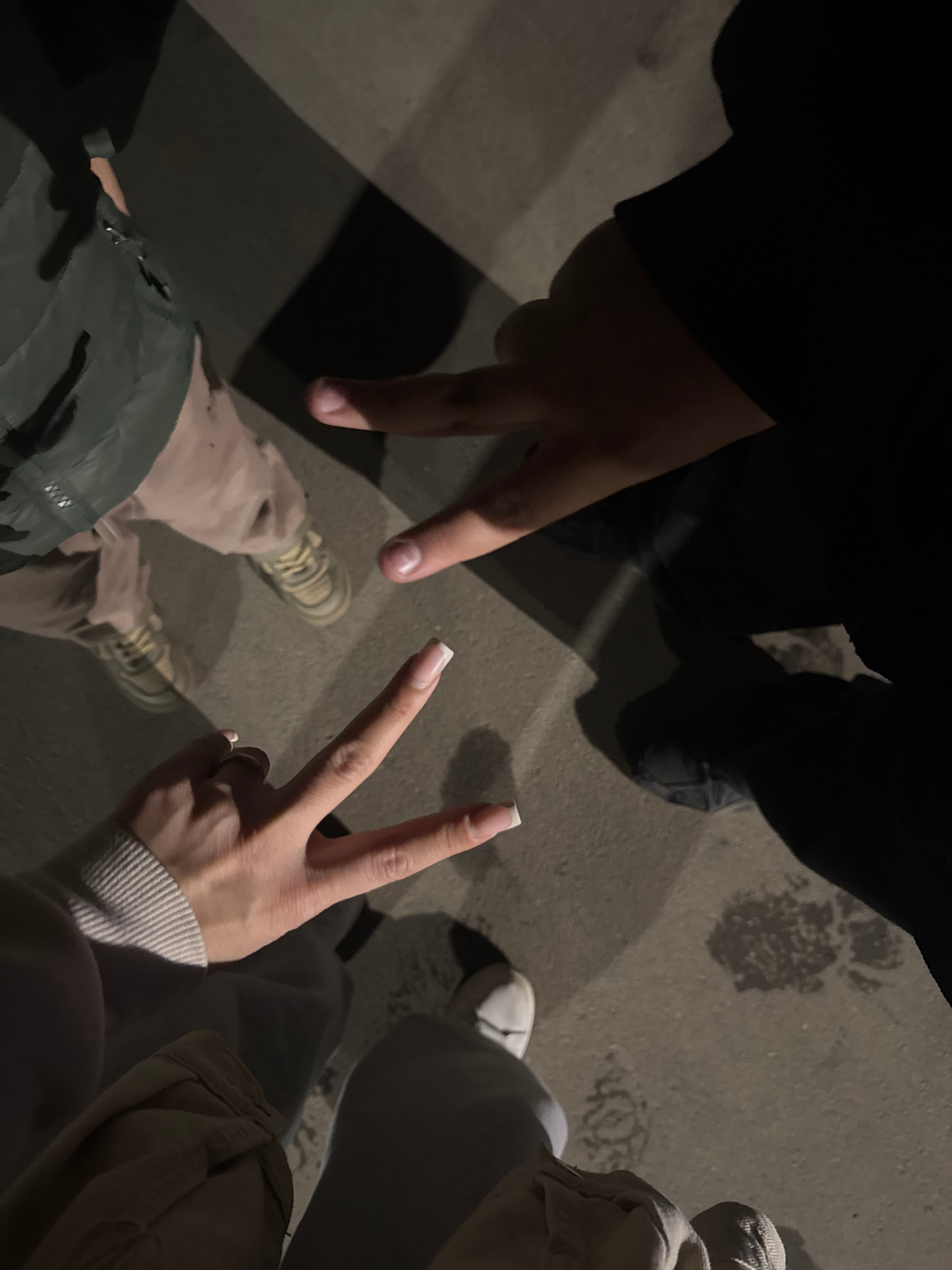 The image shows an aerial view of three people standing on a concrete surface. Two of the individuals are displaying the "peace" or "victory" hand gesture. One person is wearing dark clothing and blac…read more