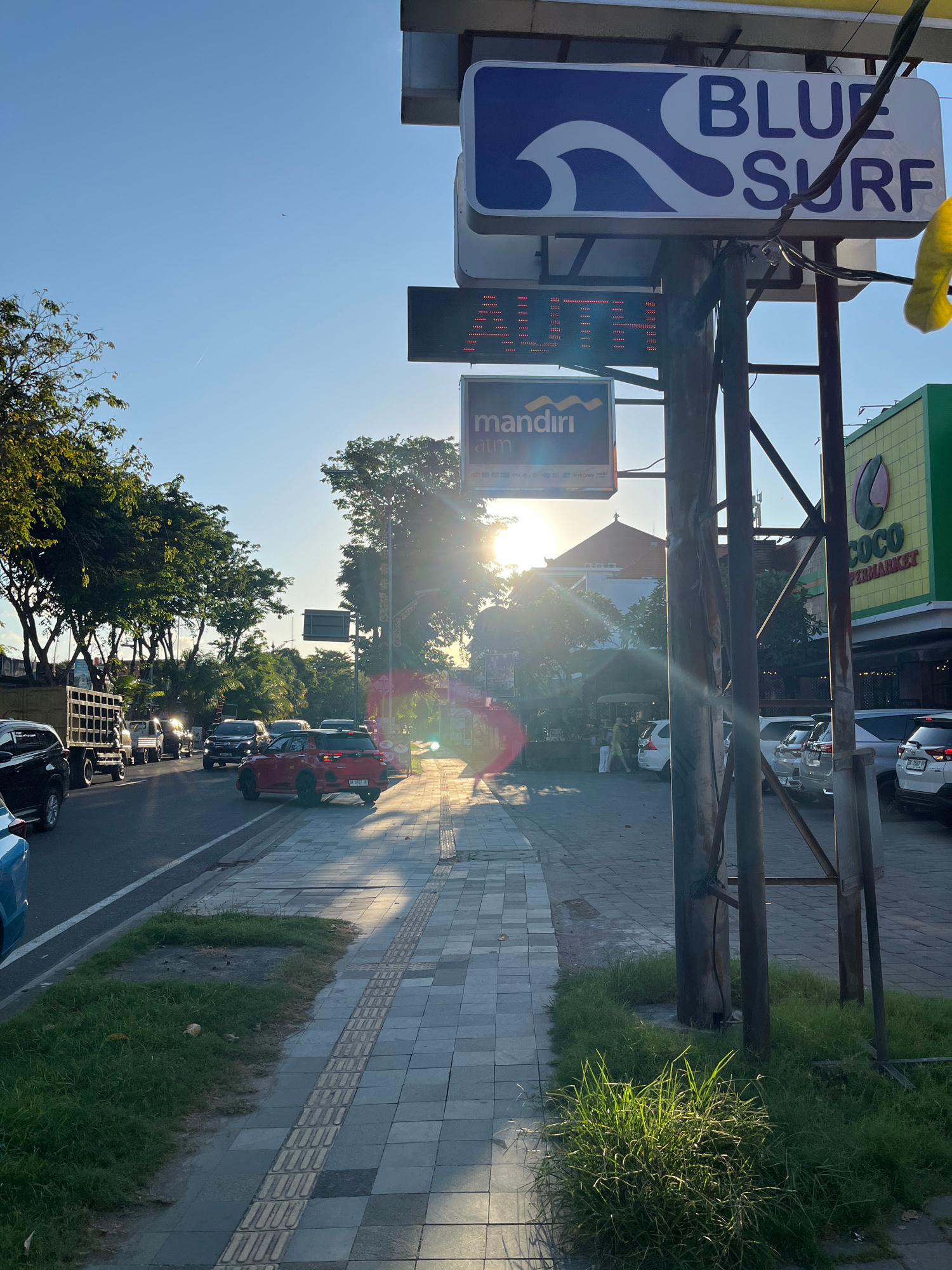 The image captures a street scene in Unknown, Indonesia. The sun, slightly obscured by trees, shines brightly down the road, casting a glare. Cars are parked along the roadside. A sidewalk runs parall…read more