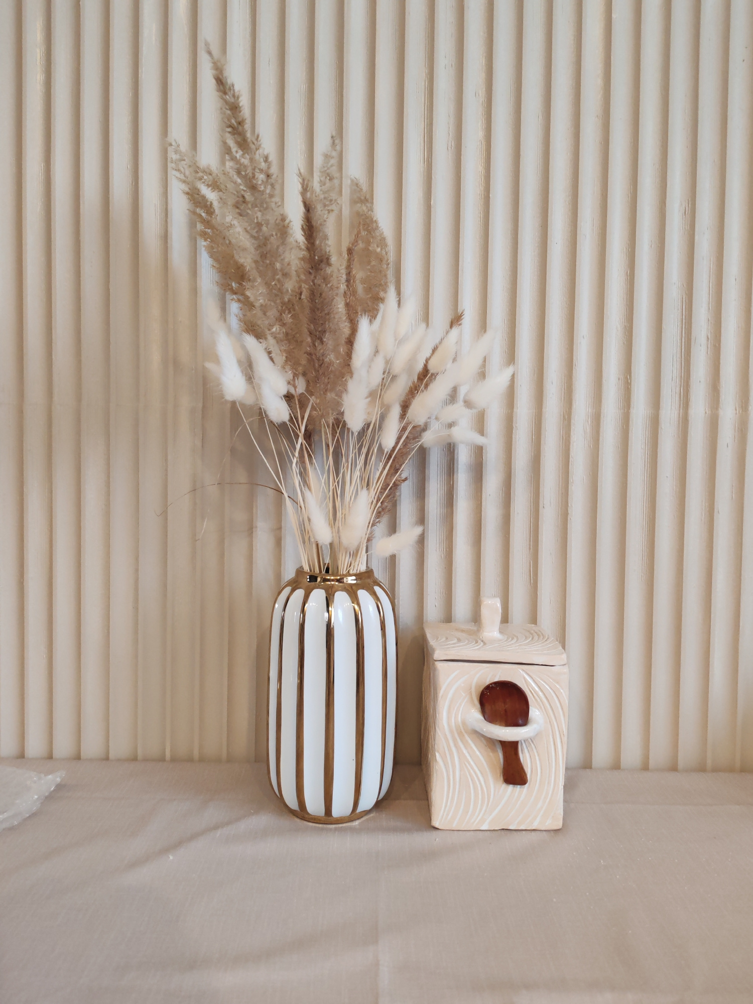The image displays a serene indoor still life arrangement, likely in Ust-Ilimsk, Russia, featuring two decorative objects against a textured wall. In the left-center, a tall, elegant white ceramic vas…read more