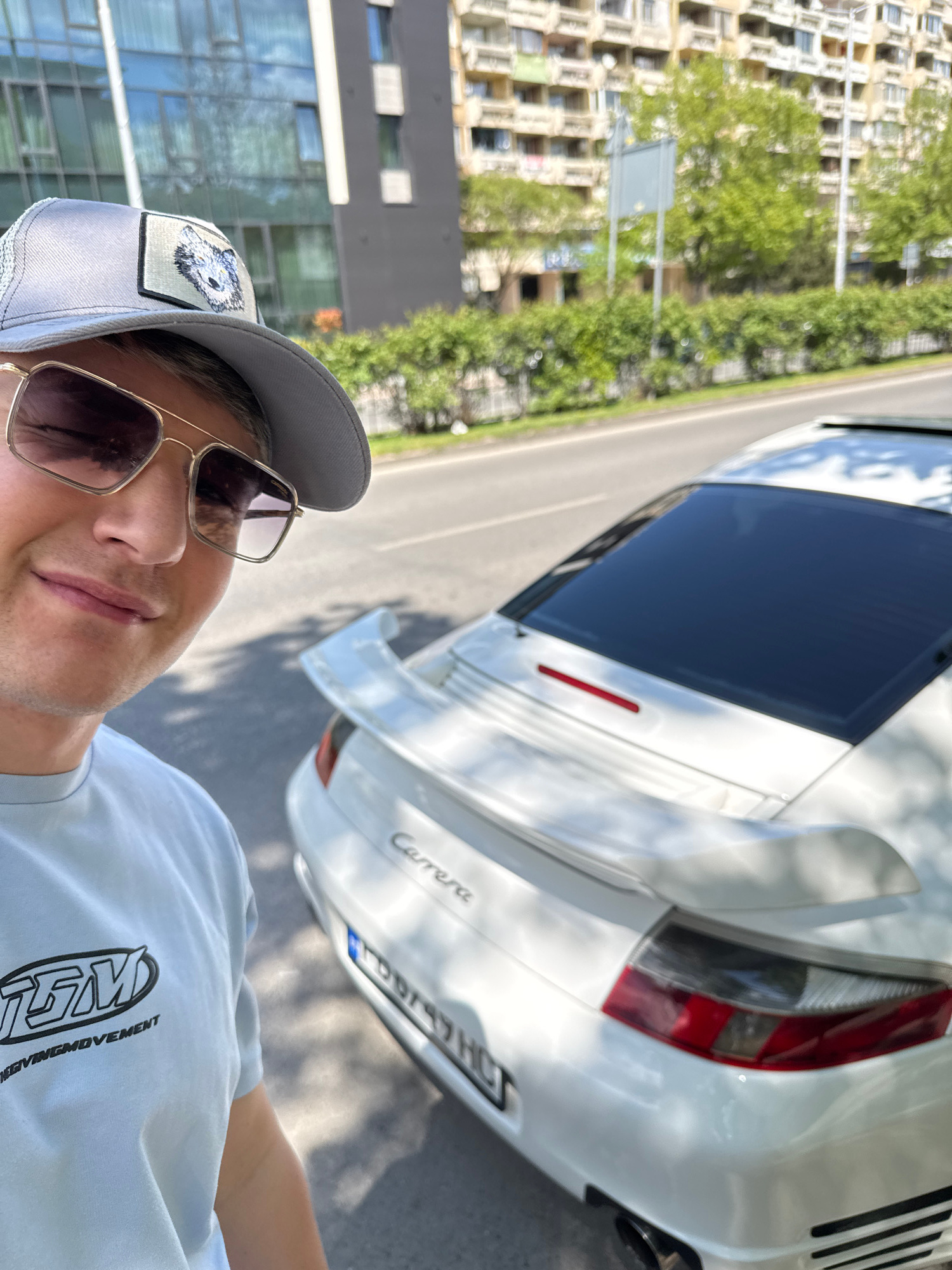The image is a selfie of a man wearing a gray baseball cap, gold-rimmed sunglasses, and a light blue t-shirt. The background features a white Porsche Carrera parked on a paved road. In the distance, t…read more