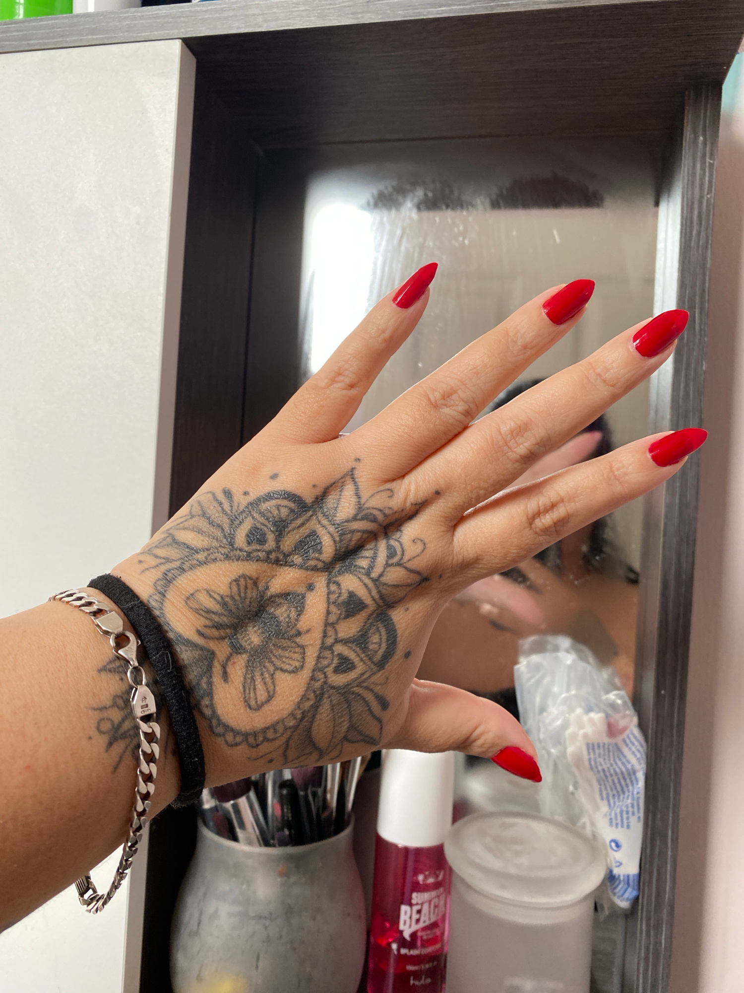 A person's right hand, adorned with striking red almond-shaped nails, is prominently featured in this close-up shot. A large, intricate tattoo in black ink covers the back of the hand, depicting mandaβ¦read more