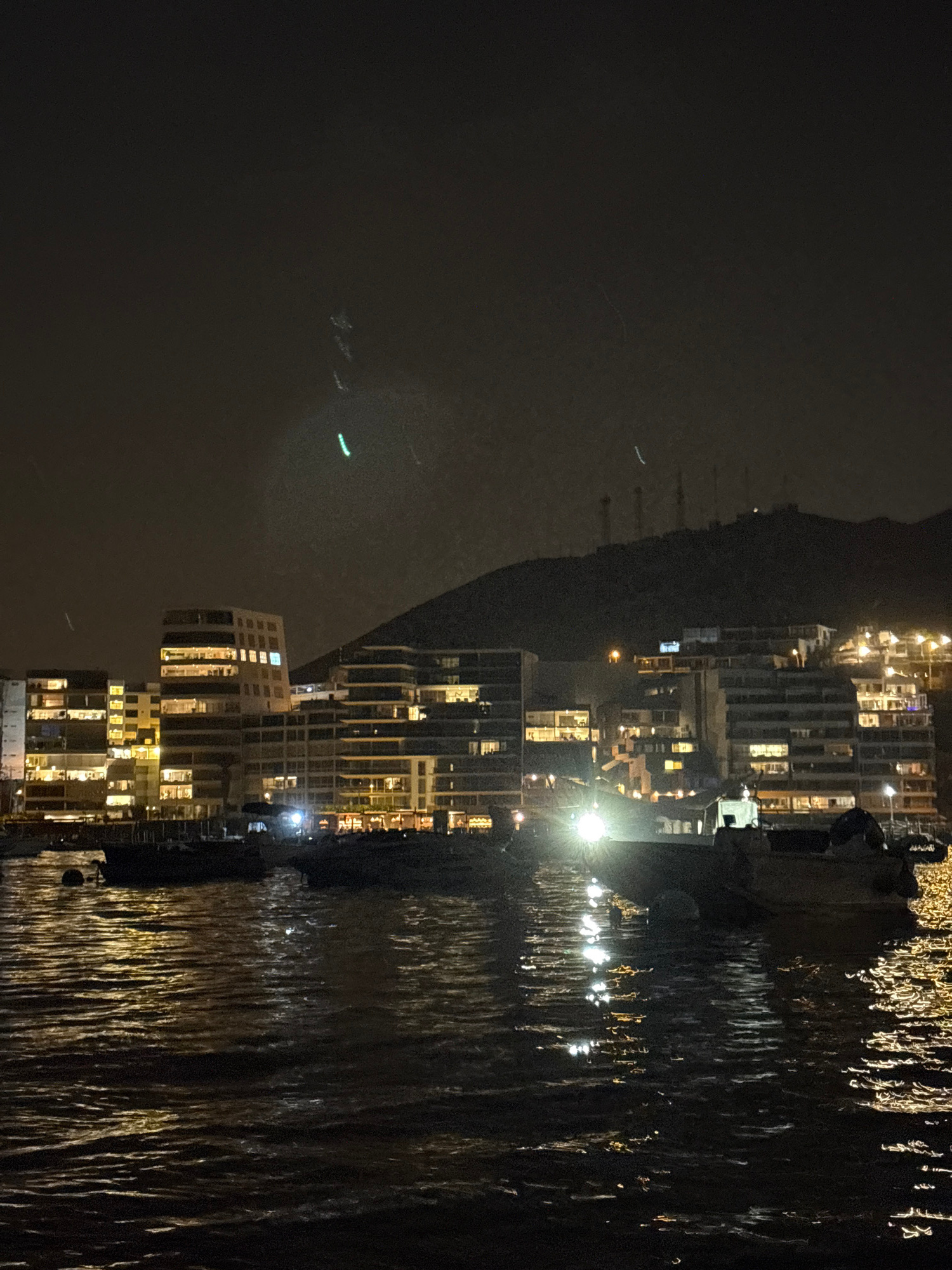 The image depicts a night scene in Ancón, Peru, with buildings illuminated along the coastline. The water reflects the city lights. The background shows a dark, mountainous landscape.