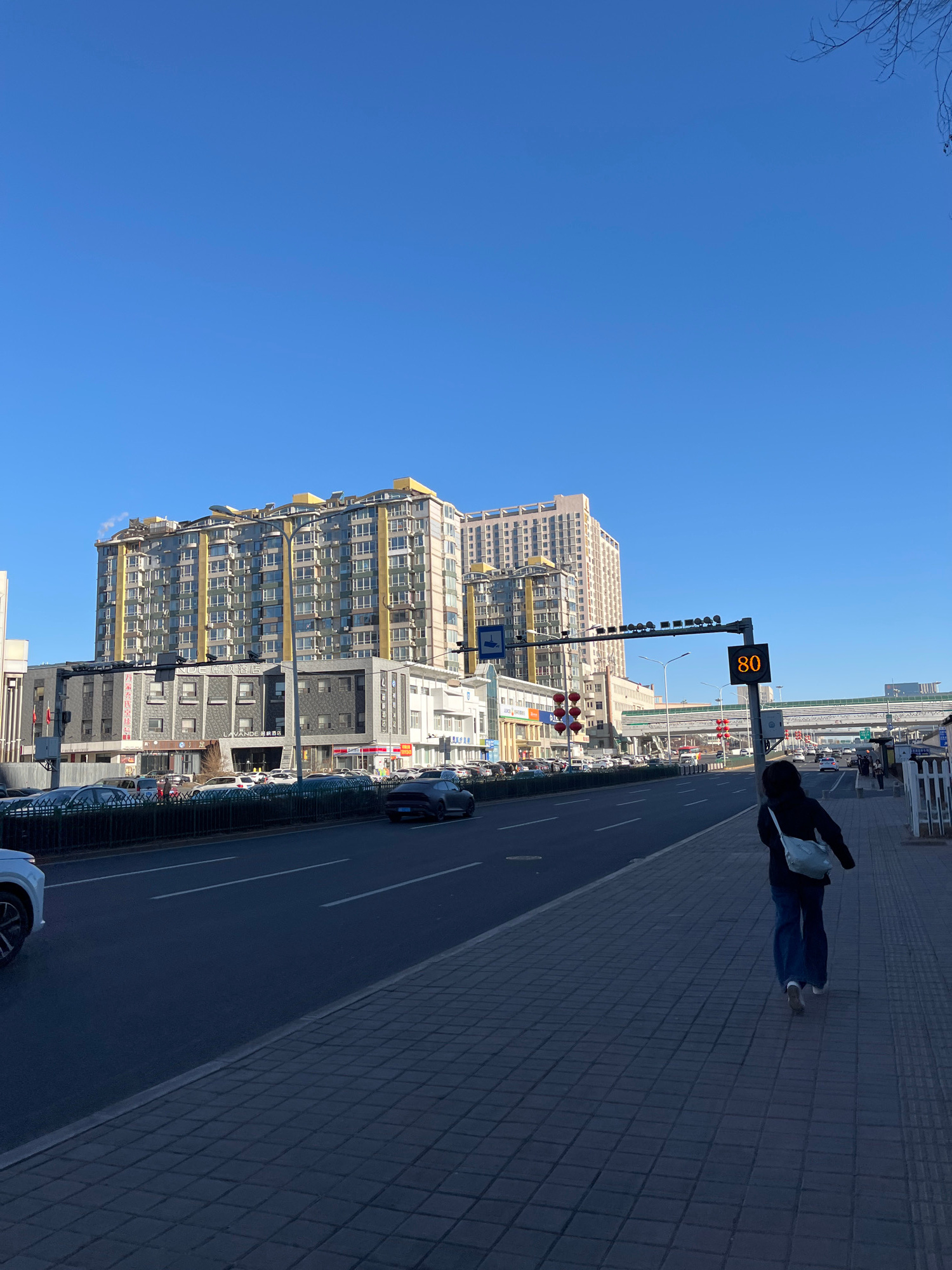 The image depicts a street scene in Changchun City, China. A person is walking on the sidewalk adjacent to a multi-lane road. Several vehicles are present on the road. A tall building with multiple wi…read more