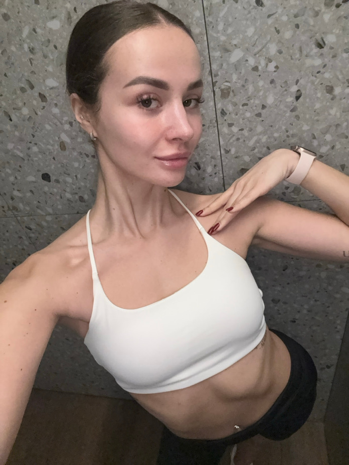 A single adult female is depicted in an indoor selfie, with the scene located in the city of Kyiv, Ukraine. She has dark hair pulled back and wears a white athletic bra and black lower garments. Visib…read more