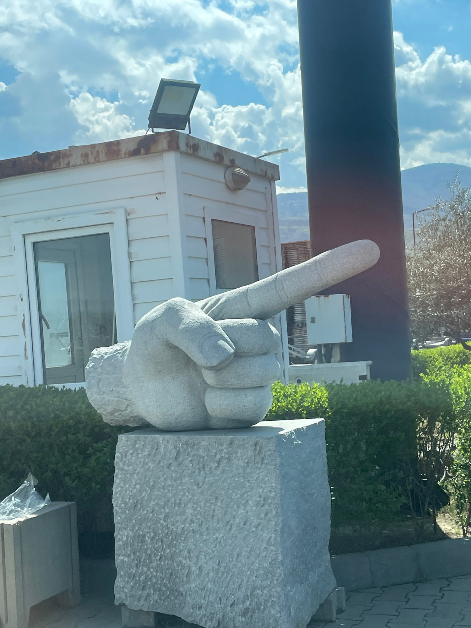 The image shows a sculpture of a hand with the index finger pointing upwards. The sculpture appears to be made of gray stone and is placed next to a small, white building with windows and a light fixt…read more