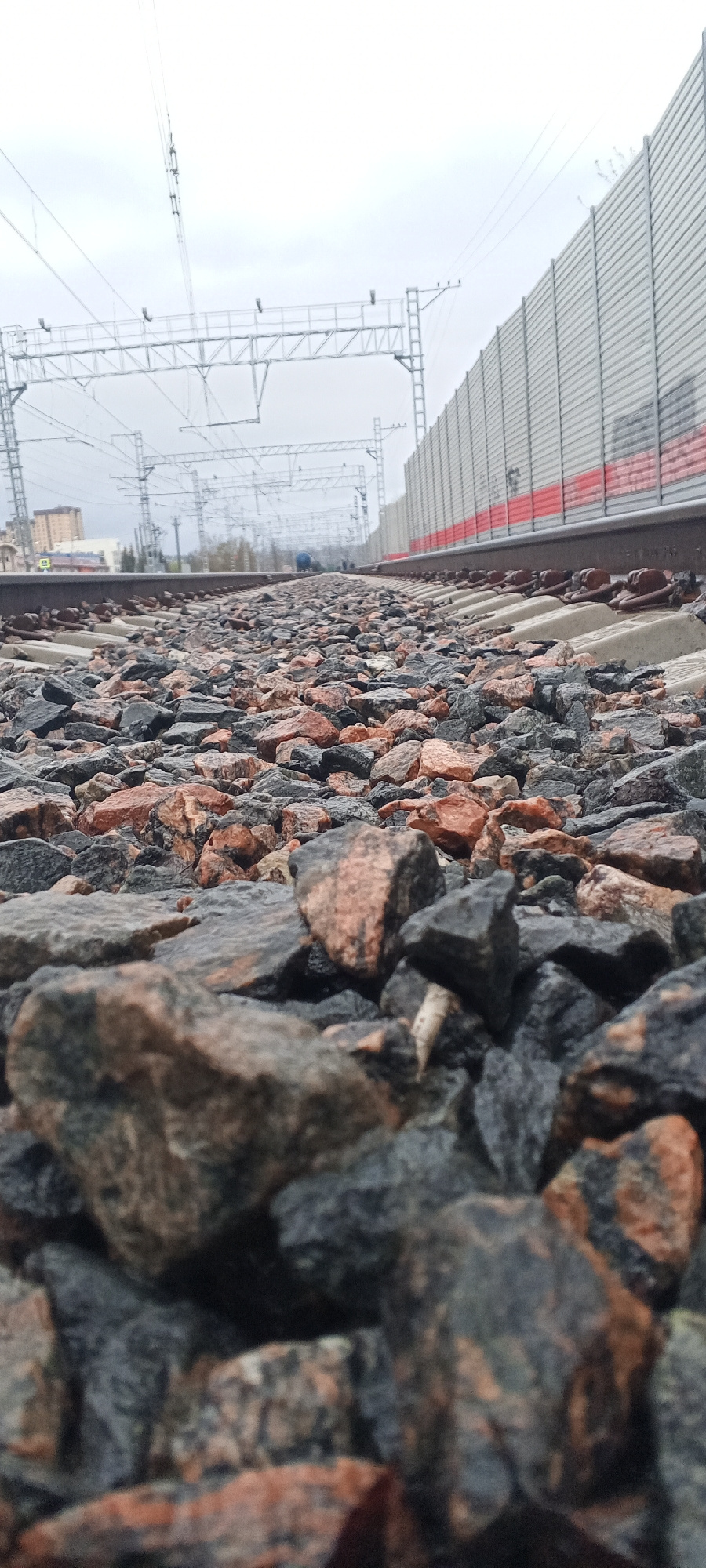 A ground-level, low-angle shot of a railway track in Dmitrov, Russia. The foreground is dominated by track ballast rocks in varying shades of gray and red, occupying most of the frame. The railway tra…read more