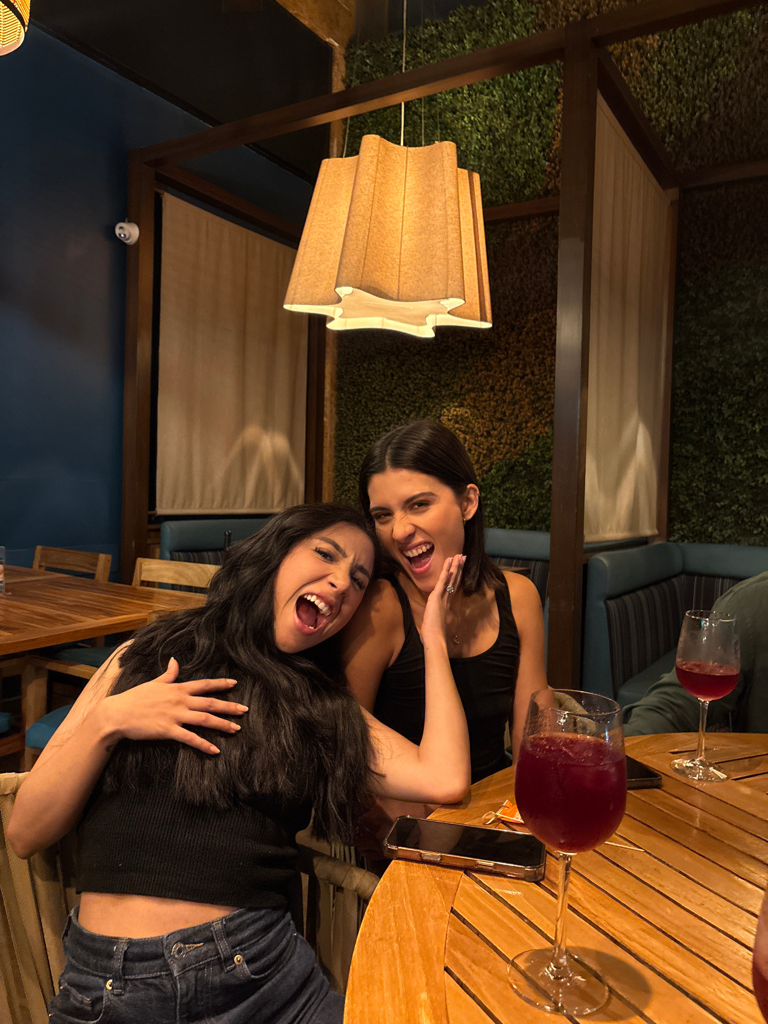 Two young women are at an outdoor restaurant or bar, seated at a wooden table with two large glasses of red liquid, possibly wine or sangria. One woman is wearing a black top and blue jeans, with a vi…read more