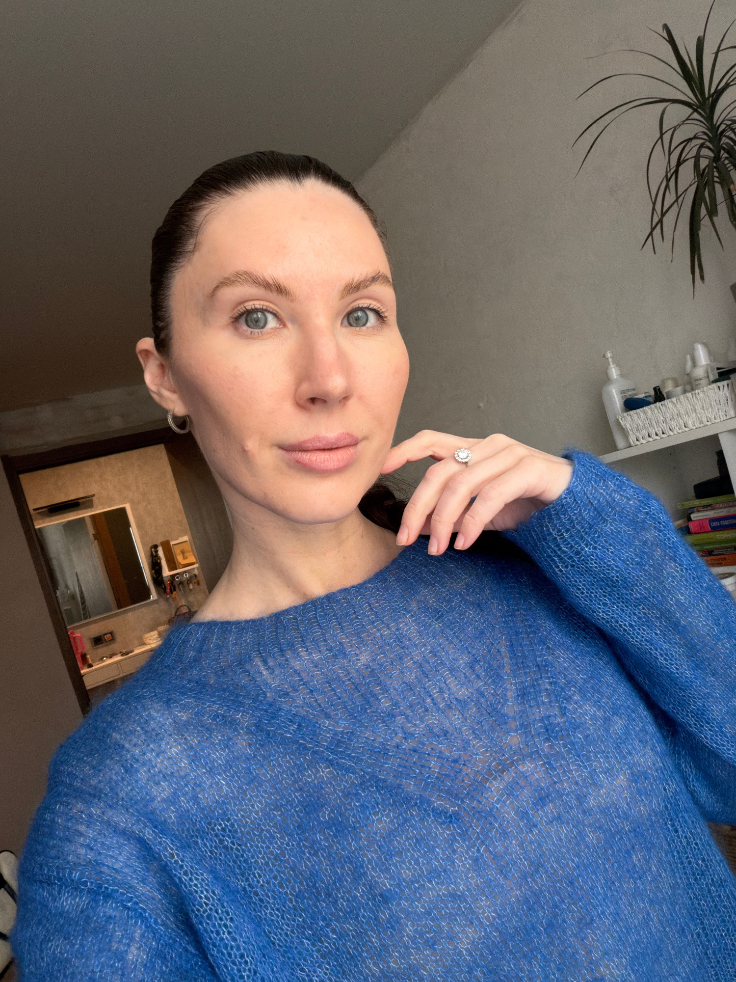 A woman is posing for a selfie indoors. She has fair skin, brown hair pulled back, and blue eyes. She is wearing a bright blue sweater and a ring is visible on her left hand. In the background, there…read more