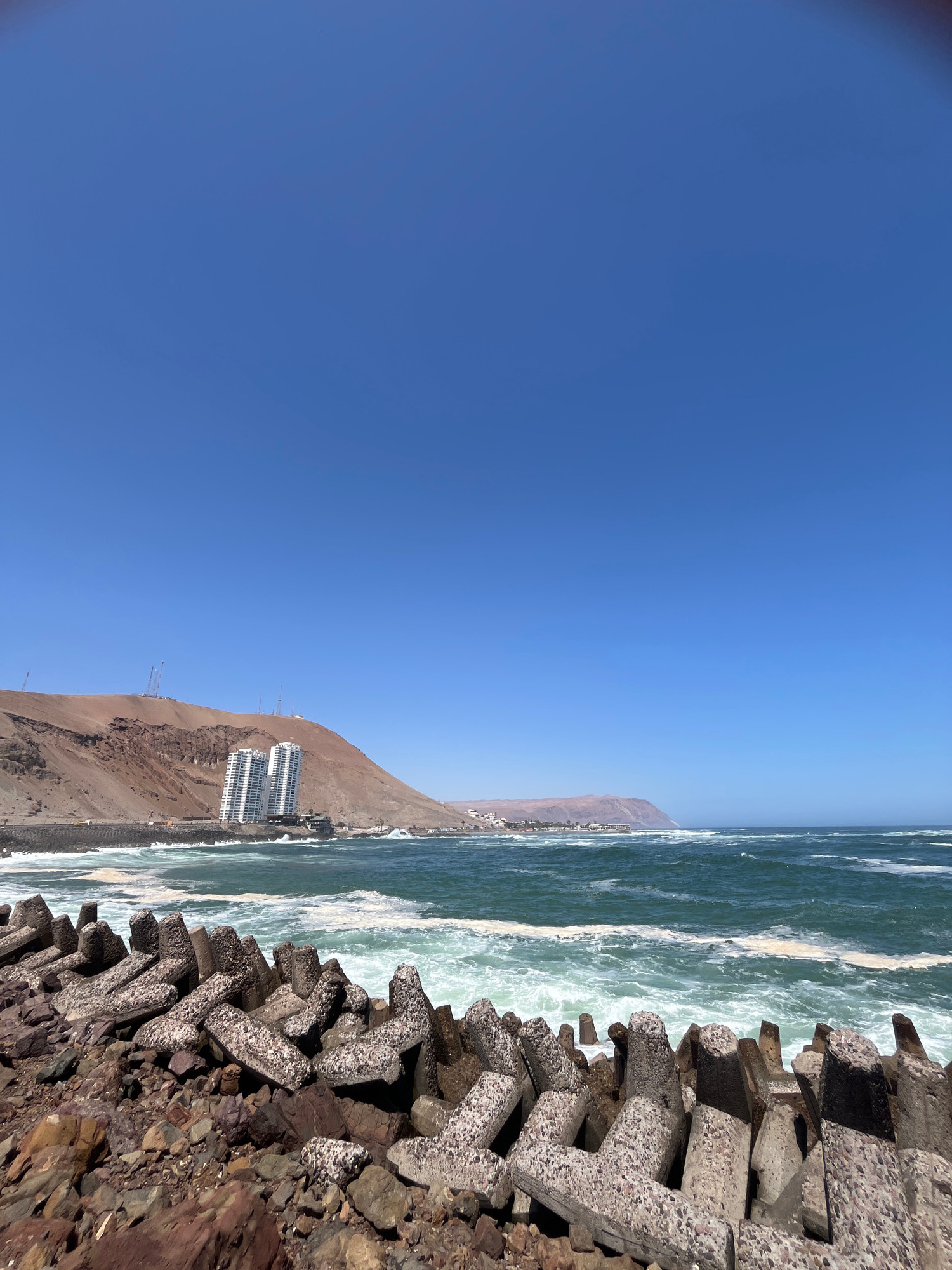View of El Morro de Arica in Arica, Chile, taken from a breakwater. The ocean waves are breaking on the rocks of the breakwater. The sky is clear. A mountain and some buildings are visible.