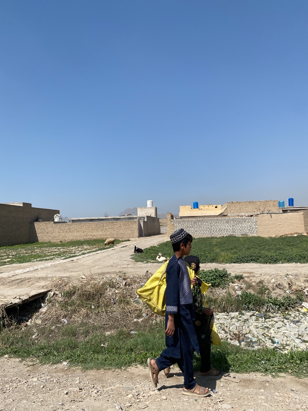 Two young boys wearing traditional clothing walk along a dirt road in Kandahar, Afghanistan. The boy in front wears a blue shalwar kameez and a patterned taqiyah, and carries a yellow bag. The second…read more