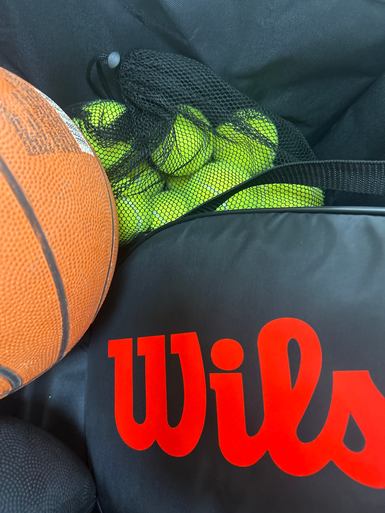 The image shows a black sports bag with a large red "Wilson" logo. Inside the bag, there is a mesh net filled with yellow tennis balls. The bottom of the image contains a brown basketball. In the lowe…read more