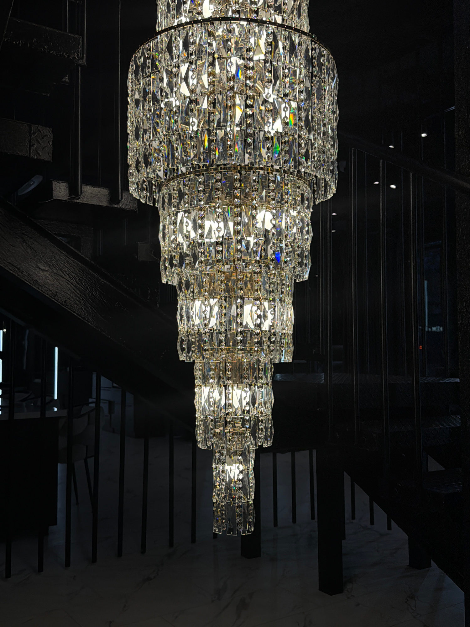 Captured from a low angle indoors, the image showcases a multi-tiered crystal chandelier juxtaposed against a dark metal staircase, with steps that diminish in length on the right. The chandelier, the…read more