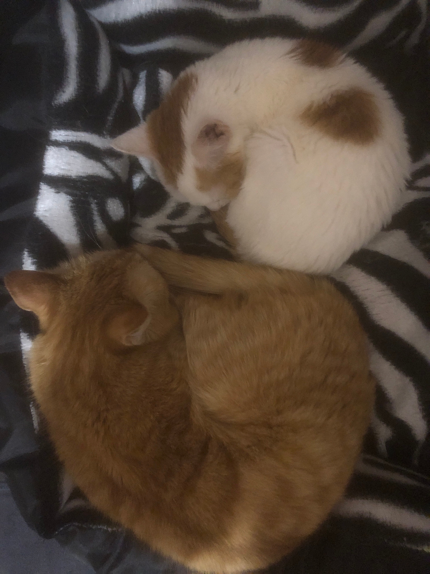 Two cats are curled up together asleep on a black and white zebra-print blanket. The cat on the left is mostly white with some brown markings on its head and ears. The cat on the right is orange. The…read more