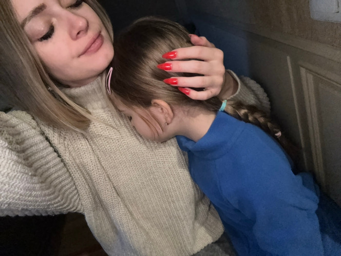 Two individuals are seen closely. One wears a blue sweatshirt and has a braid. The other wears a light beige sweater. The individual in blue is partially visible, with a hand resting on the second per…read more
