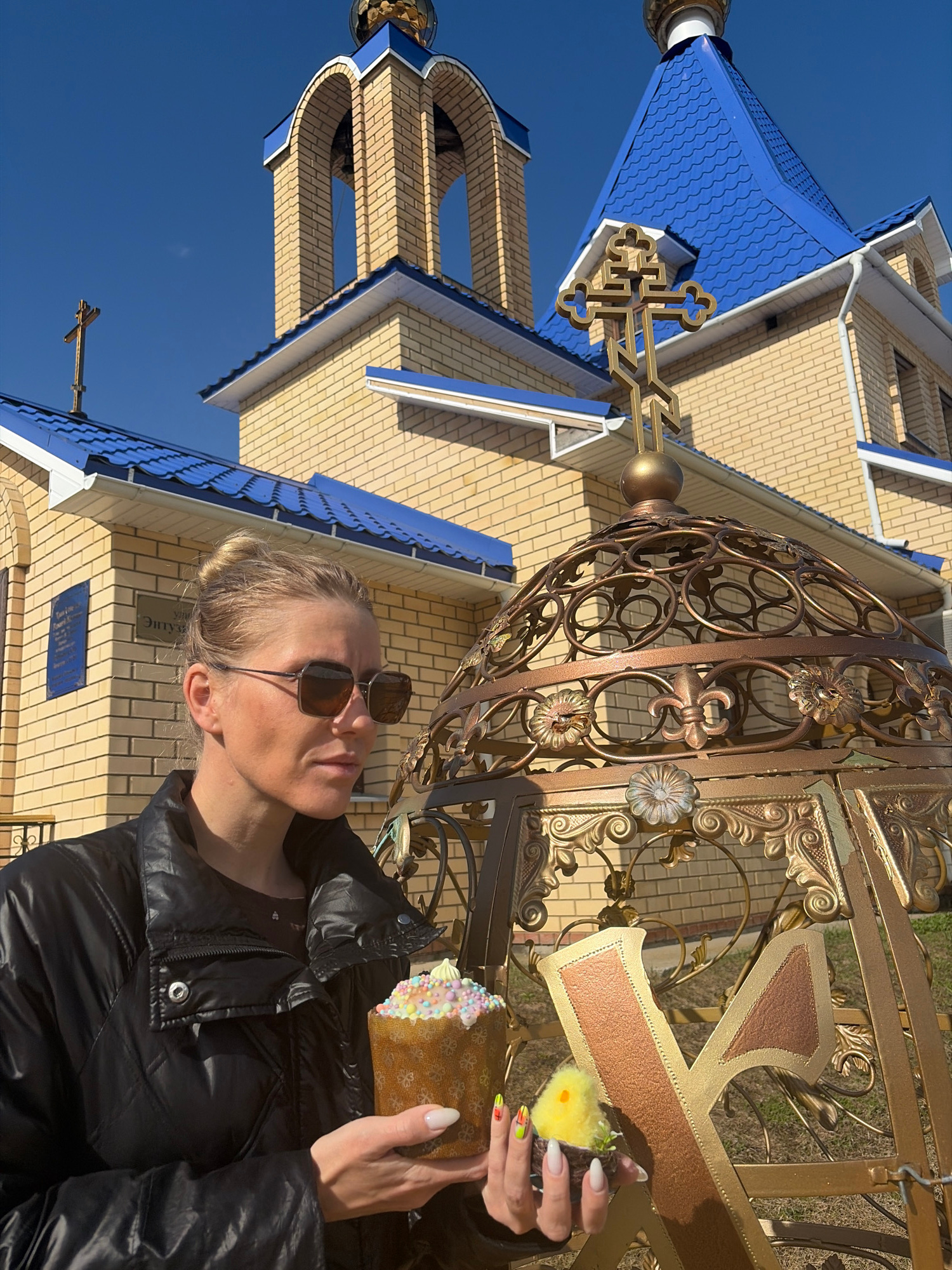 A woman in a black jacket and sunglasses holds an Easter cake and a chick toy in front of a golden metal gate and the Church of the Holy New Martyrs and Confessors of Russia in Chaikovsky, Russia. The…read more