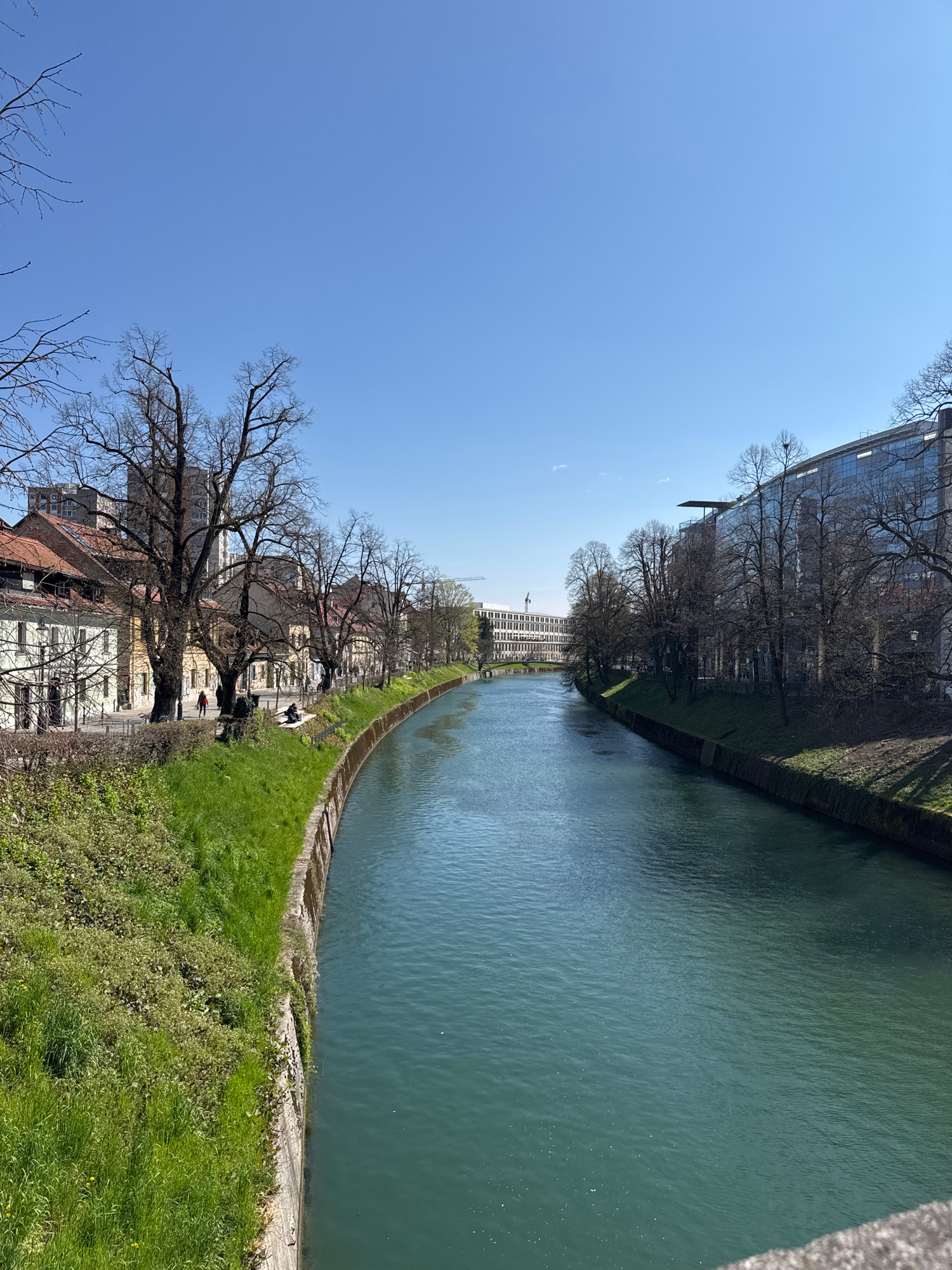 This image depicts a panoramic view along the Ljubljanica River in Ljubljana, Slovenia, looking downstream. The sky is clear and uniformly blue with no discernible clouds. The river, occupying the ce…read more