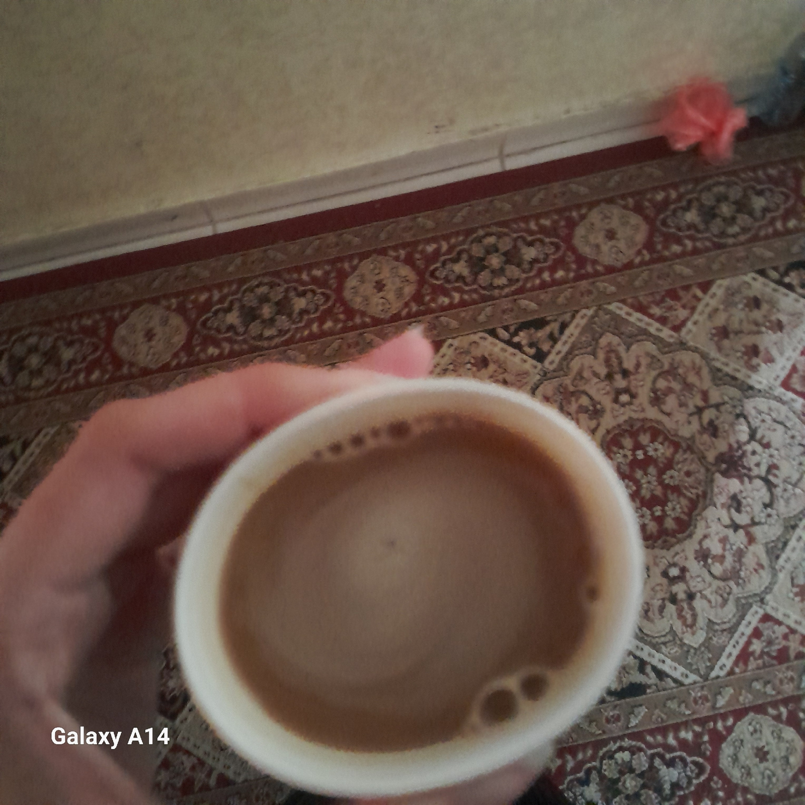 An overhead shot captures a hand holding a white cup filled with a light brown beverage, likely coffee or tea with milk. Small bubbles are visible on the beverage's surface. The cup appears to be disp…read more