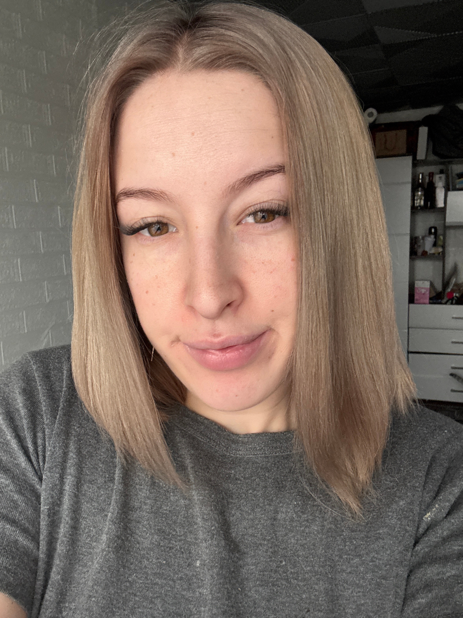 A close-up, angled portrait of a woman with fair skin and light brown hair. She is wearing a gray t-shirt. Her eyes are light brown. The background behind her is out of focus, but there are some shelv…read more