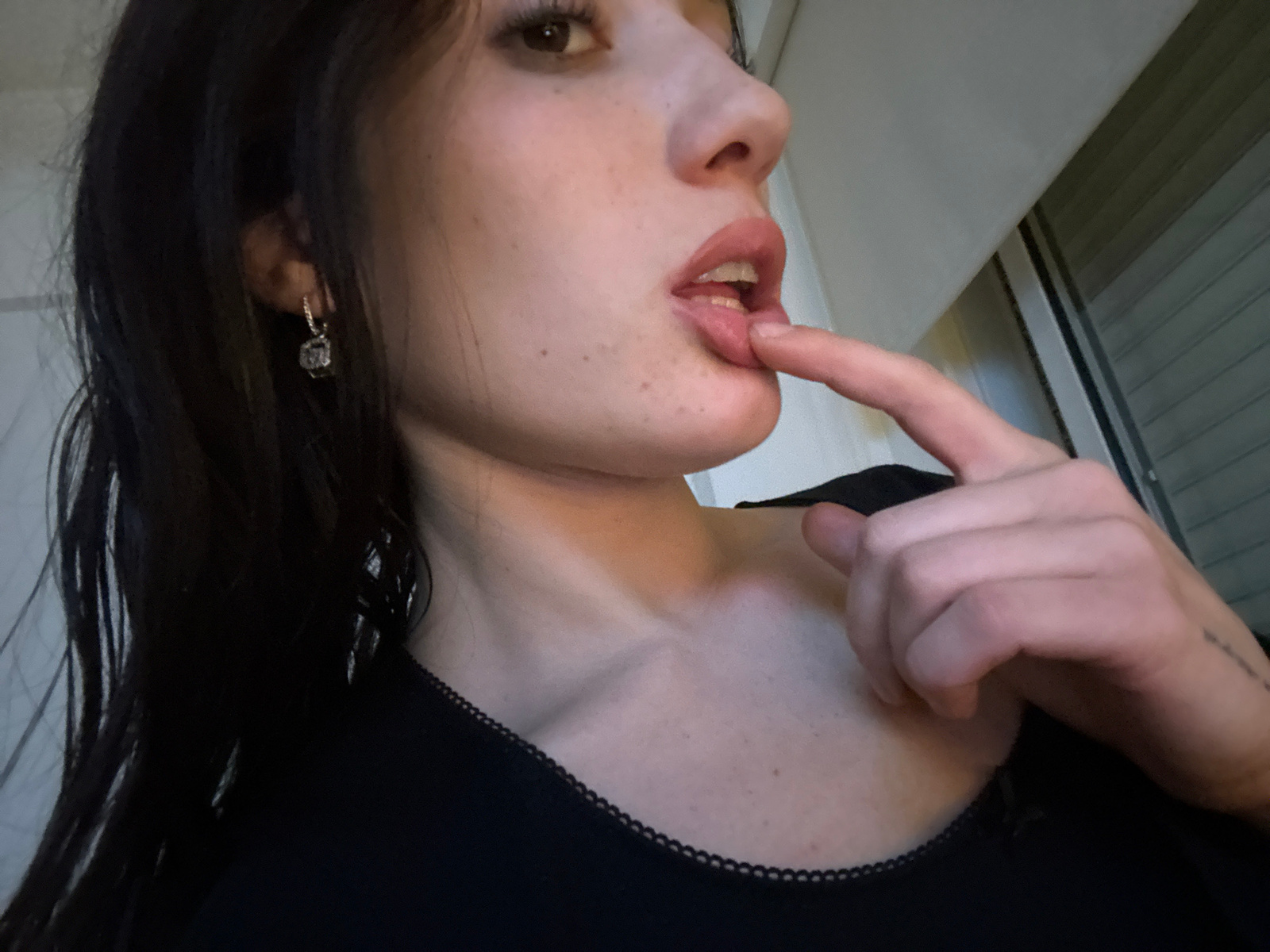 A woman is positioned in the foreground, looking off to the right of the frame with her finger touching her lower lip. She has fair skin, dark hair, and is wearing a black top with a decorative neckli…read more