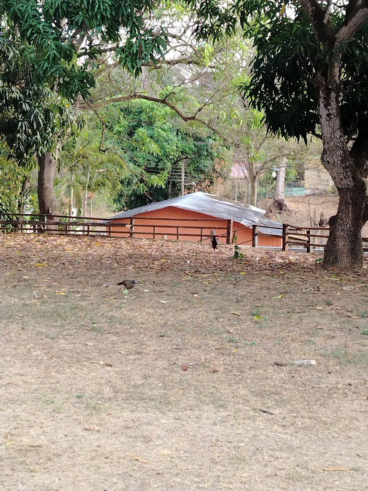 The image depicts a rural scene in Los Leoncitos, Venezuela. A small, single-story building with an orange exterior and a corrugated metal roof is partially visible behind a wooden fence. The foregrou…read more