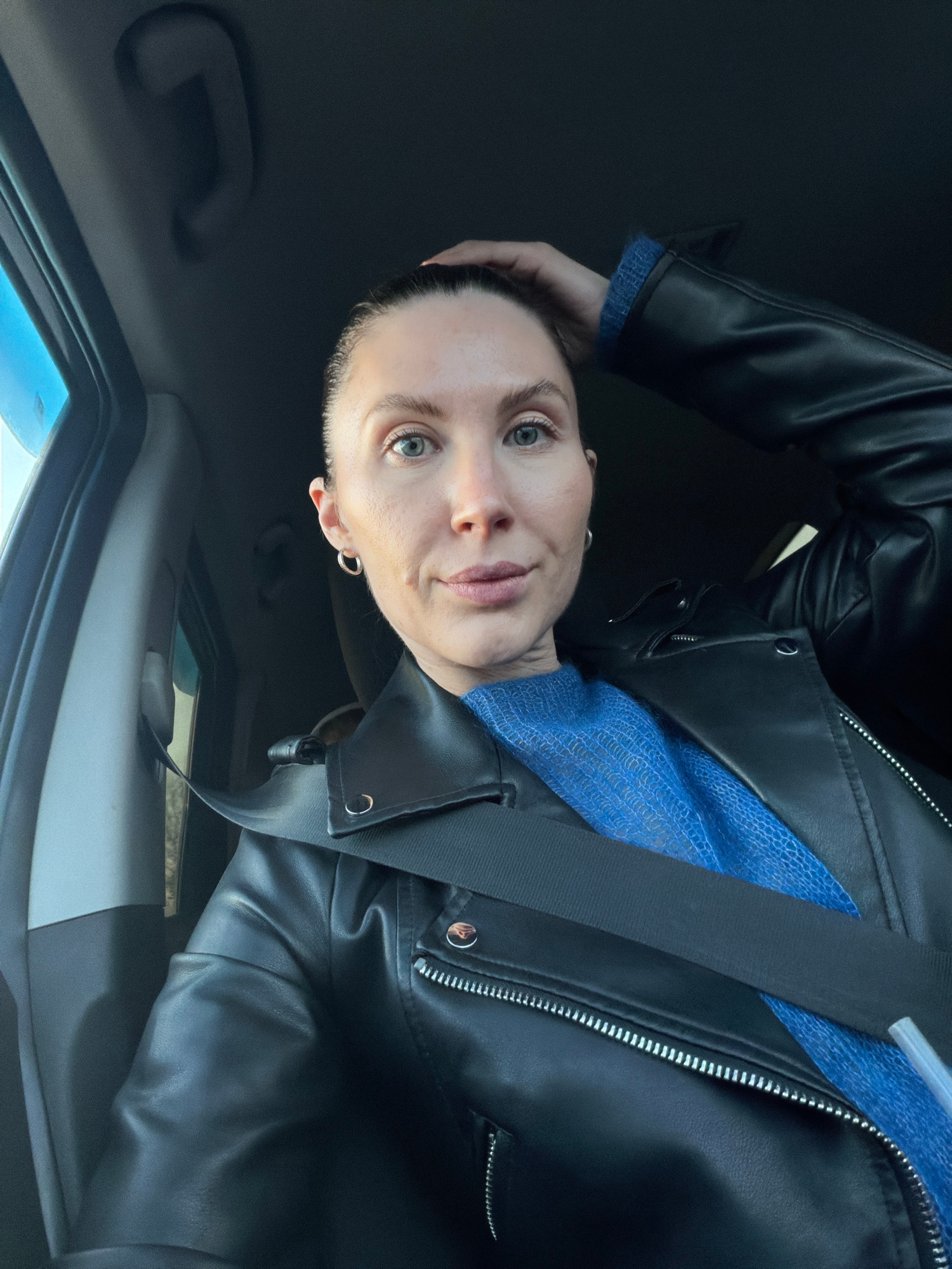 A selfie taken inside a car, rotated approximately 180 degrees. A woman with light skin and blue eyes wears a blue sweater and a black leather jacket. She has short, dark hair and a small hoop earring…read more