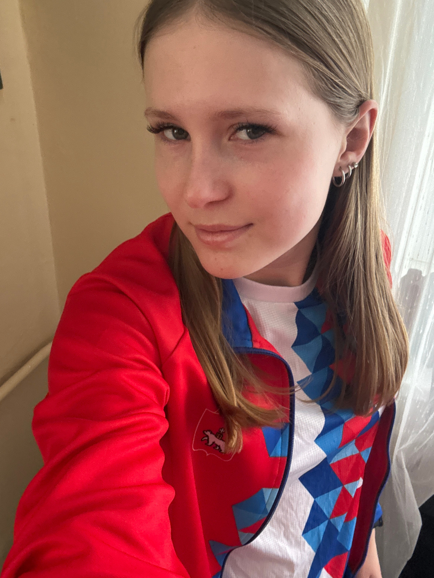 A portrait of a young woman with fair skin and light brown hair is captured in a close-up shot. She has light-colored eyes, a slight smile, and multiple piercings in her left ear. She is wearing a whi…read more