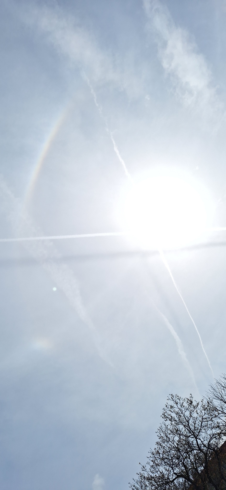 The image shows a daytime sky with a bright sun and a visible 22-degree halo. There are thin clouds and contrails in the sky. Bare tree branches are visible in the upper right corner. The location is…read more