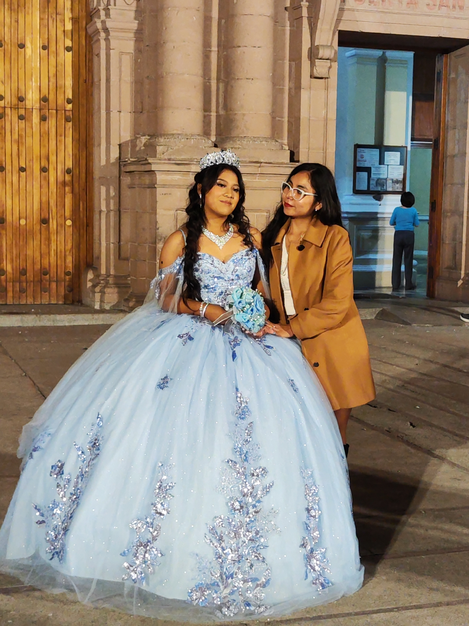 The photograph depicts two young women standing outside a stone building. The woman on the left is wearing a light blue ballgown adorned with silver embellishments, a jeweled tiara, and a necklace. She holds a bouquet of blue flowers. The woman on the right is wearing a tan coat over a white top, with glasses. She is looking at the woman in the gown. The building has a large wooden door to the left and an open doorway behind them. A child in a blue shirt and dark pants is visible in the doorway. The setting appears to be in the city of Tacna, Peru, as evidenced by the architectural style of the building, which is consistent with churches in the area. The ground is paved. | Open Wire