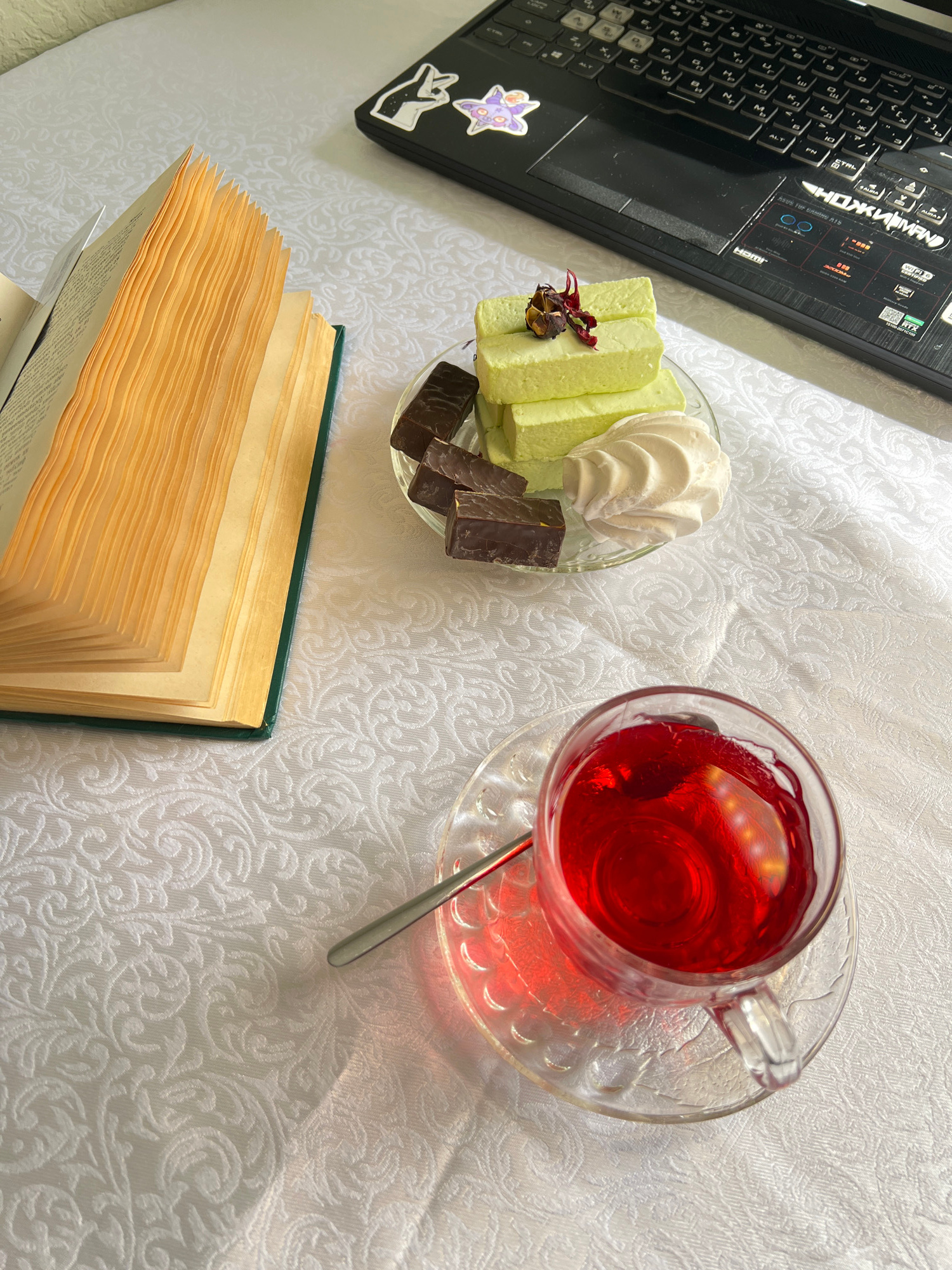 This eye-level, indoor shot depicts a still life arrangement on a white, patterned surface. A portion of a black laptop is visible in the upper left corner, adorned with stickers. Adjacent to the lapt…read more