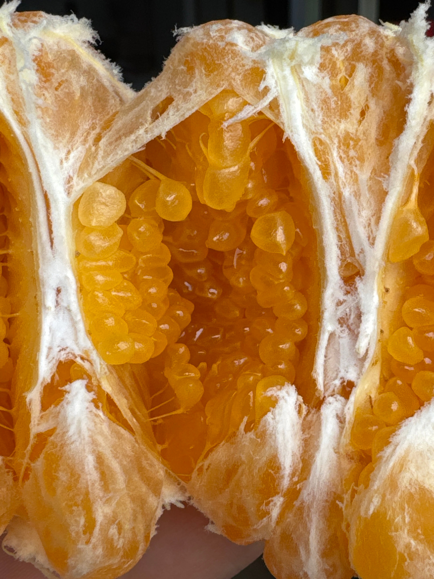 The image shows a close-up view of a segmented citrus fruit, possibly a mandarin orange, that has been pulled apart. The fruit sections are visible, each containing translucent, juice-filled vesicles.…read more