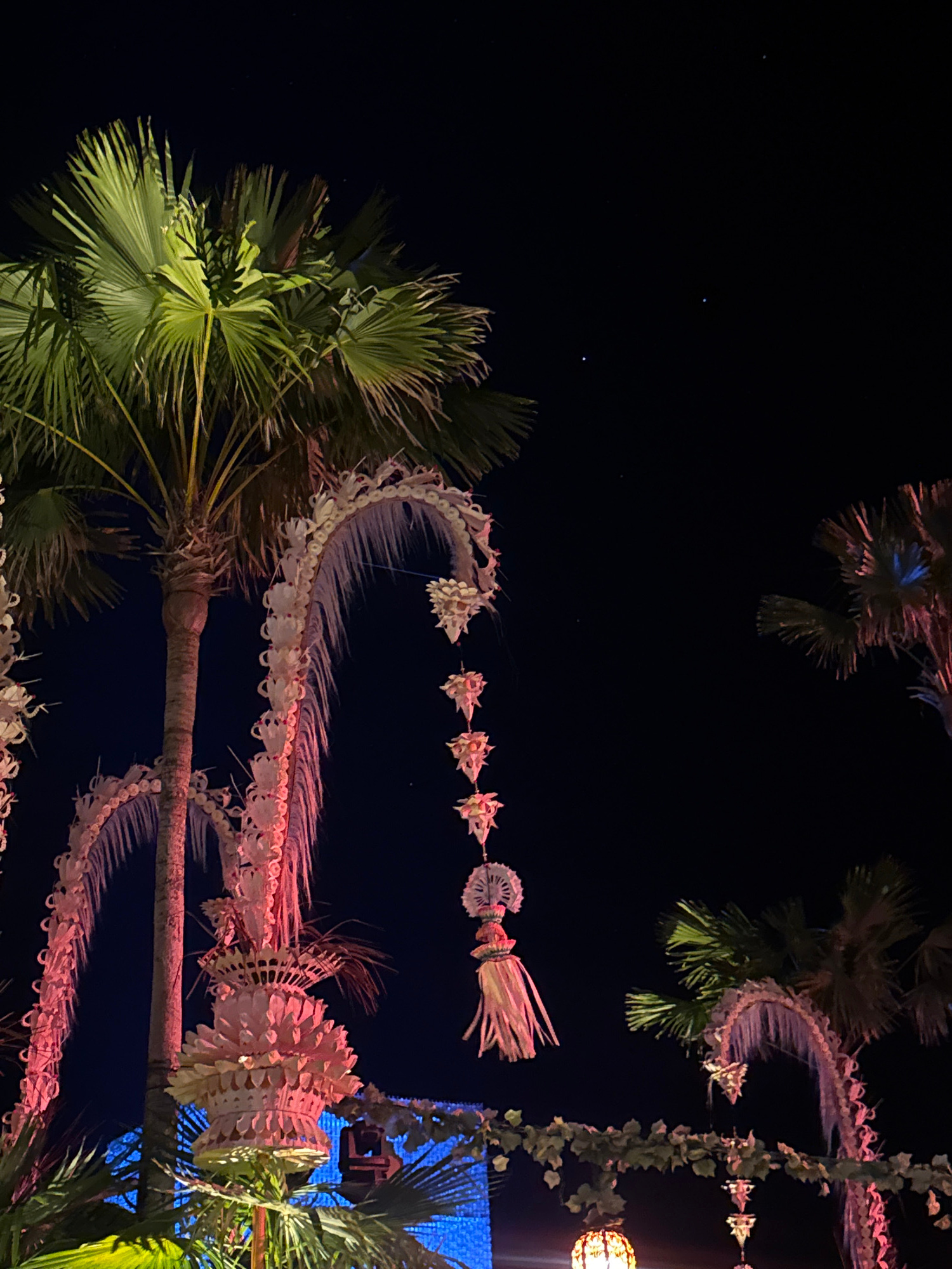 This nighttime photograph captures an elaborate festive scene set against a dark sky, likely in a tropical location such as Kuta Selatan, Indonesia. The primary subjects are several tall palm trees an…read more