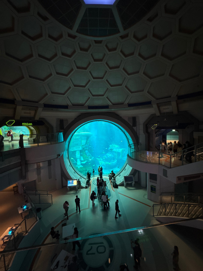 The image depicts the main viewing area of The National Aquarium at Al Qana, Abu Dhabi, United Arab Emirates. The scene is a multi-level, dimly lit indoor space dominated by a massive circular aquariu…read more