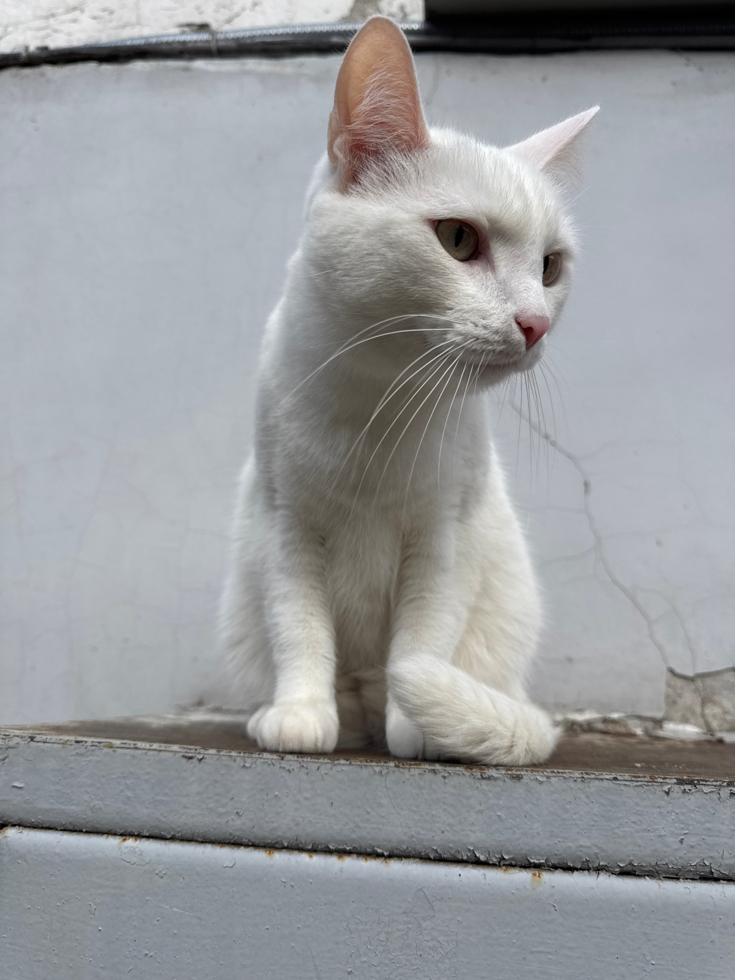 A close-up, slightly low-angle shot features a white cat with a pink nose. It is lying down on a gray, weathered, metal surface, looking up and to the left. The background consists of a white wall and…read more