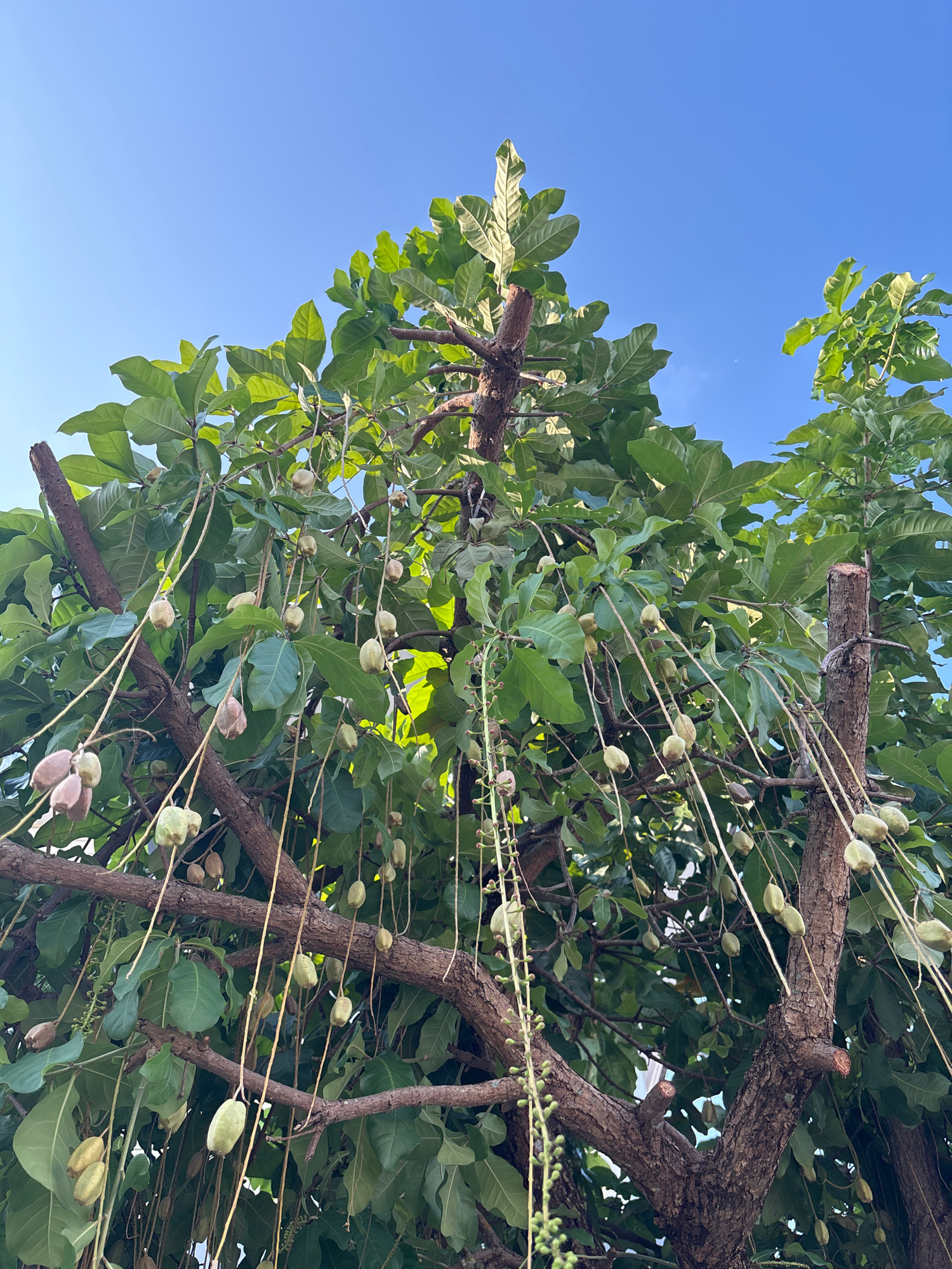 The image depicts a tree with green leaves and light green fruits hanging from long stems, set against a clear blue sky. The tree has thick, brown branches and appears to be located outdoors. The loca…read more