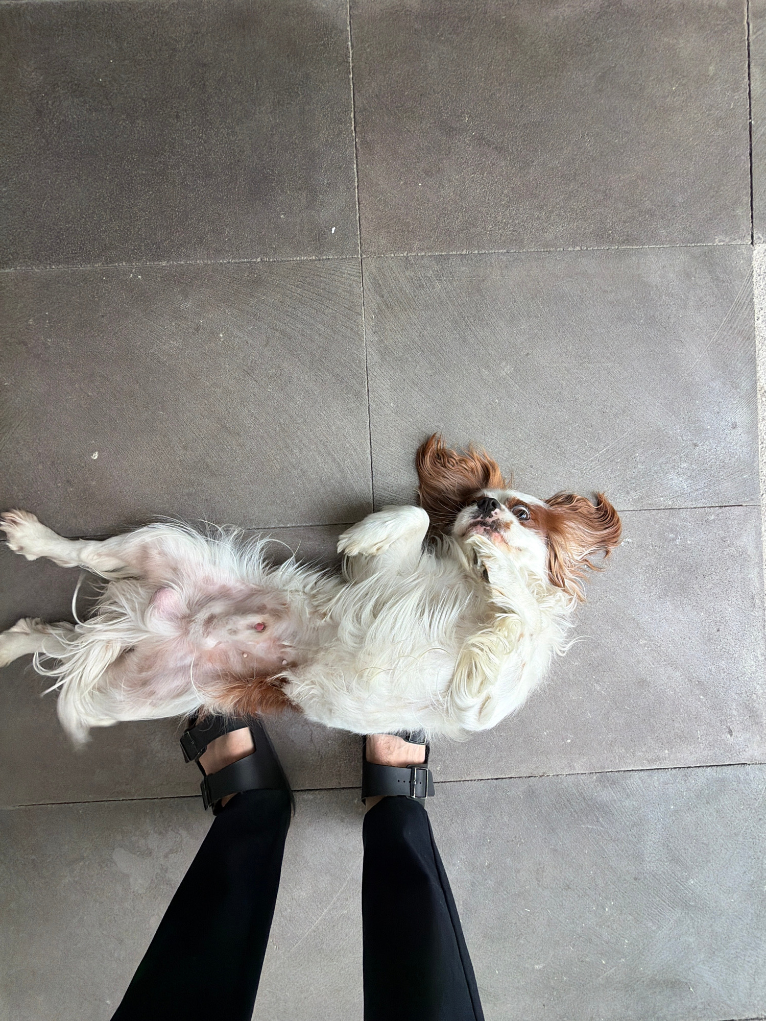 A medium-sized Cavalier King Charles Spaniel dog lies on its back on a gray-tiled surface, next to a person wearing black pants and black sandals. The dog has white and brown fur and is looking upward…read more