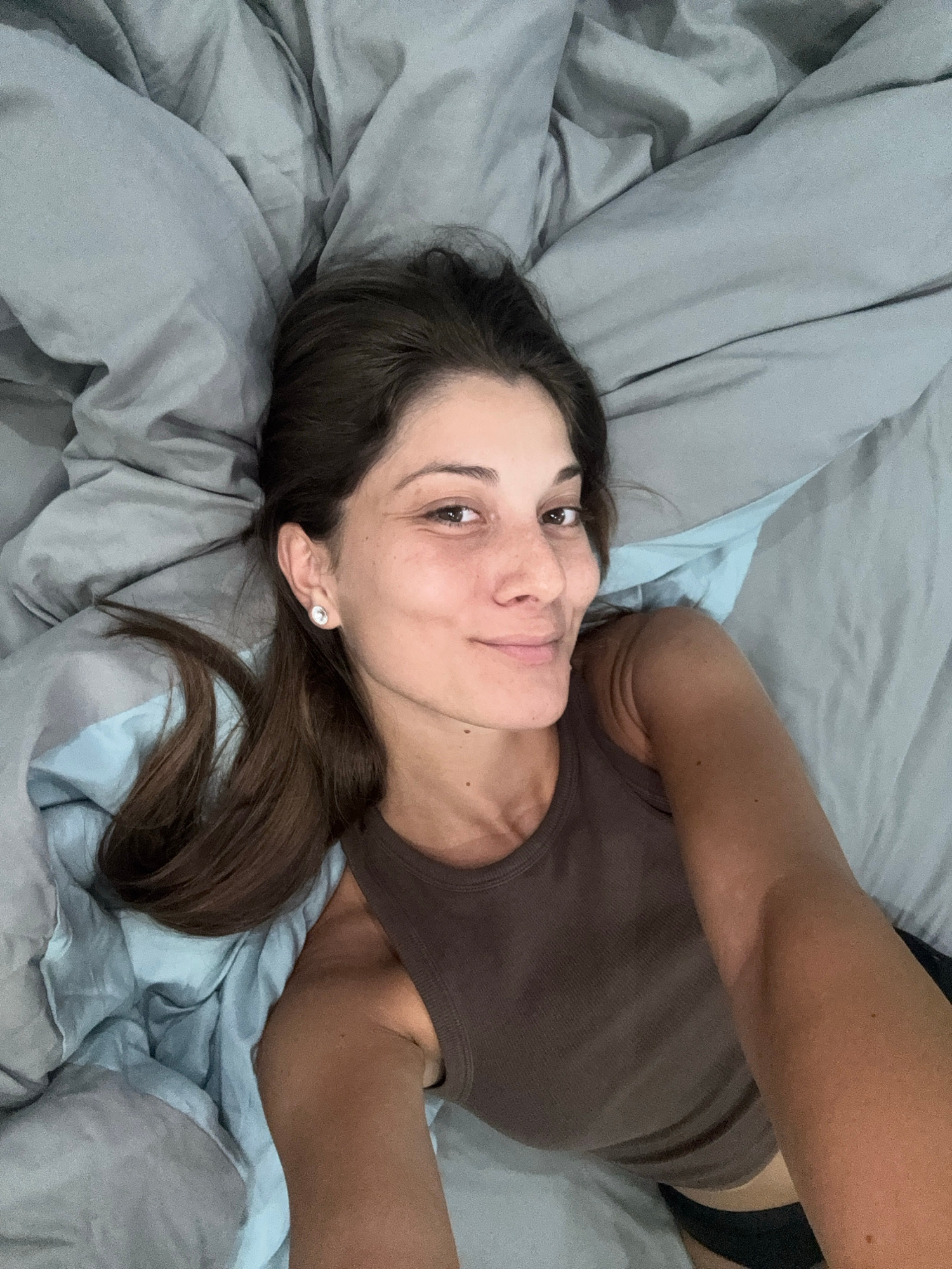 A woman lies on a bed covered with light grey and light blue bedding. She is wearing a brown tank top. Her dark brown hair is partially spread out on the pillow. She is looking at the camera. A small…read more