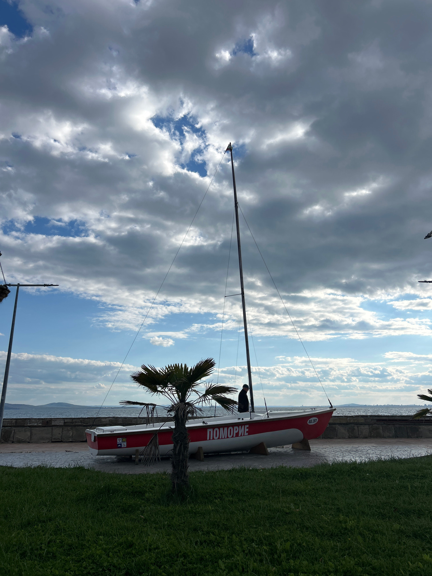 The image captures an outdoor coastal scene in Pomorie, Bulgaria, featuring a sailboat on land under a partly cloudy sky. The photograph is oriented vertically, showing a bright, daytime setting. The…read more