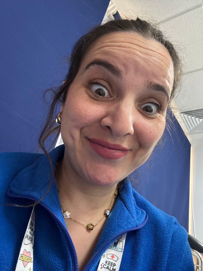 A female with brown hair, pulled back, gazes directly into the camera with wide eyes and raised eyebrows, displaying horizontal forehead wrinkles. Her eyes are brown, and her eyelashes show mascara ap…read more