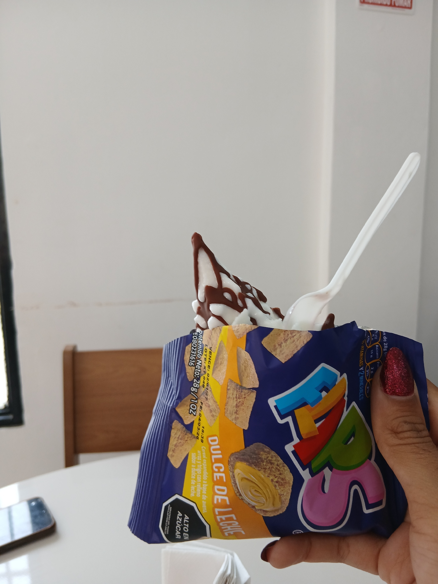 The image shows a hand holding an open bag of "Flaps" Dulce de Leche cereal. A white plastic spoon with a dollop of ice cream covered in chocolate syrup is emerging from the bag. The bag is predominan…read more