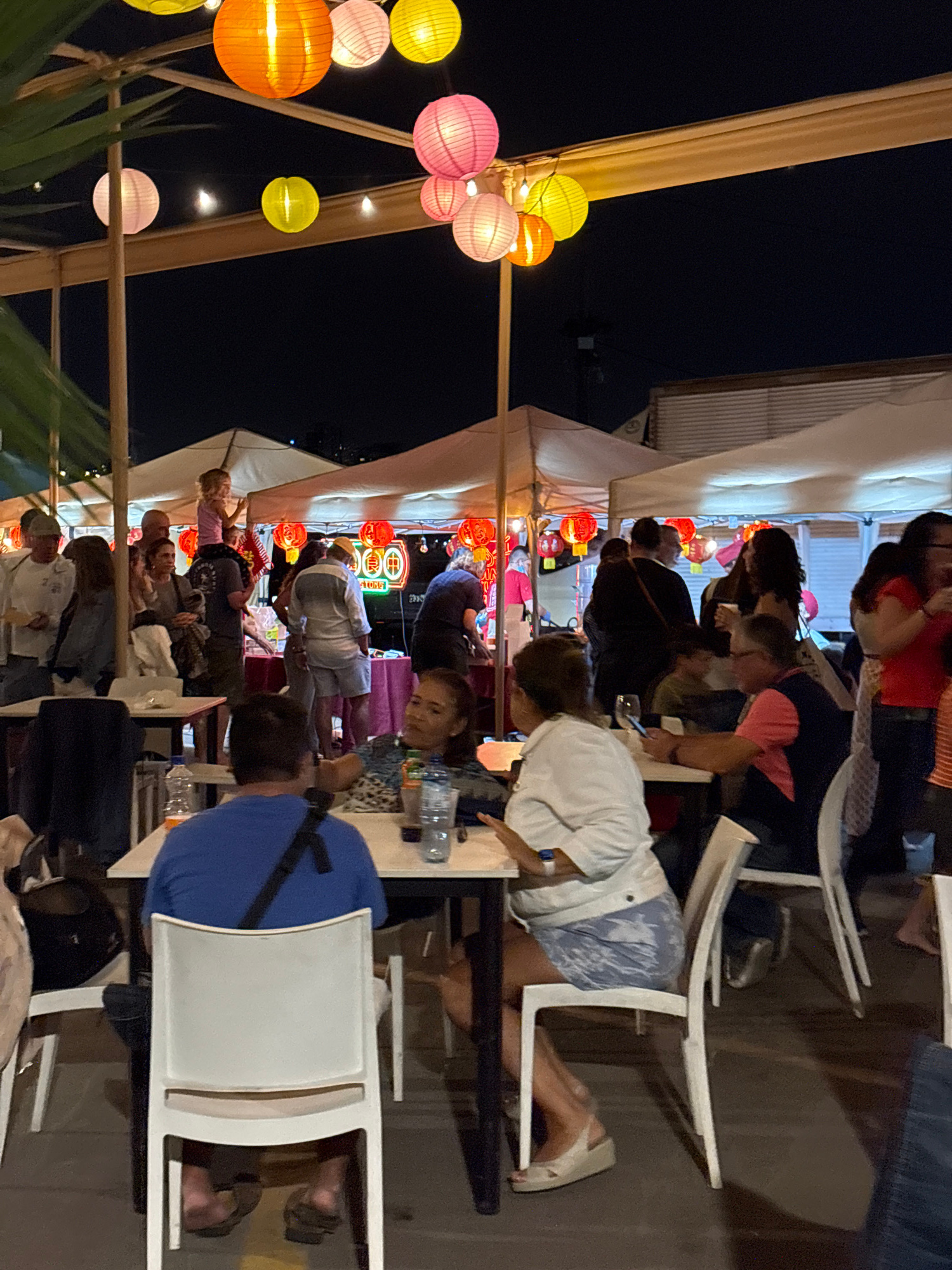 The image shows an outdoor event taking place at night in Chorrillos, Peru. Several people are seated at tables under a canopy decorated with colorful lanterns. They appear to be eating or socializing…read more