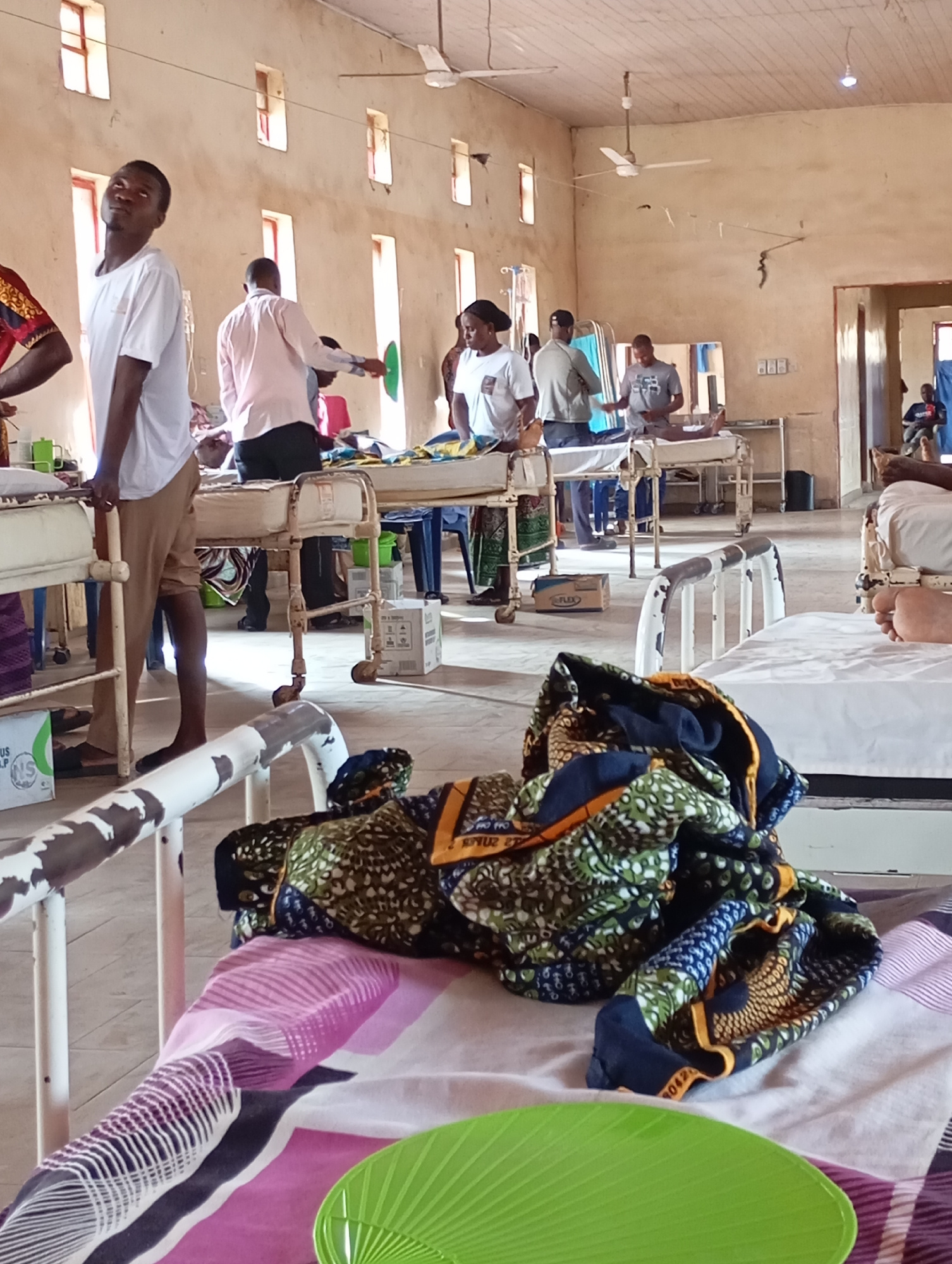 The image depicts an indoor scene, likely in a medical facility in Shendam, Nigeria. Numerous hospital beds with white metal frames are arranged in rows. Several individuals are present, some standing…read more
