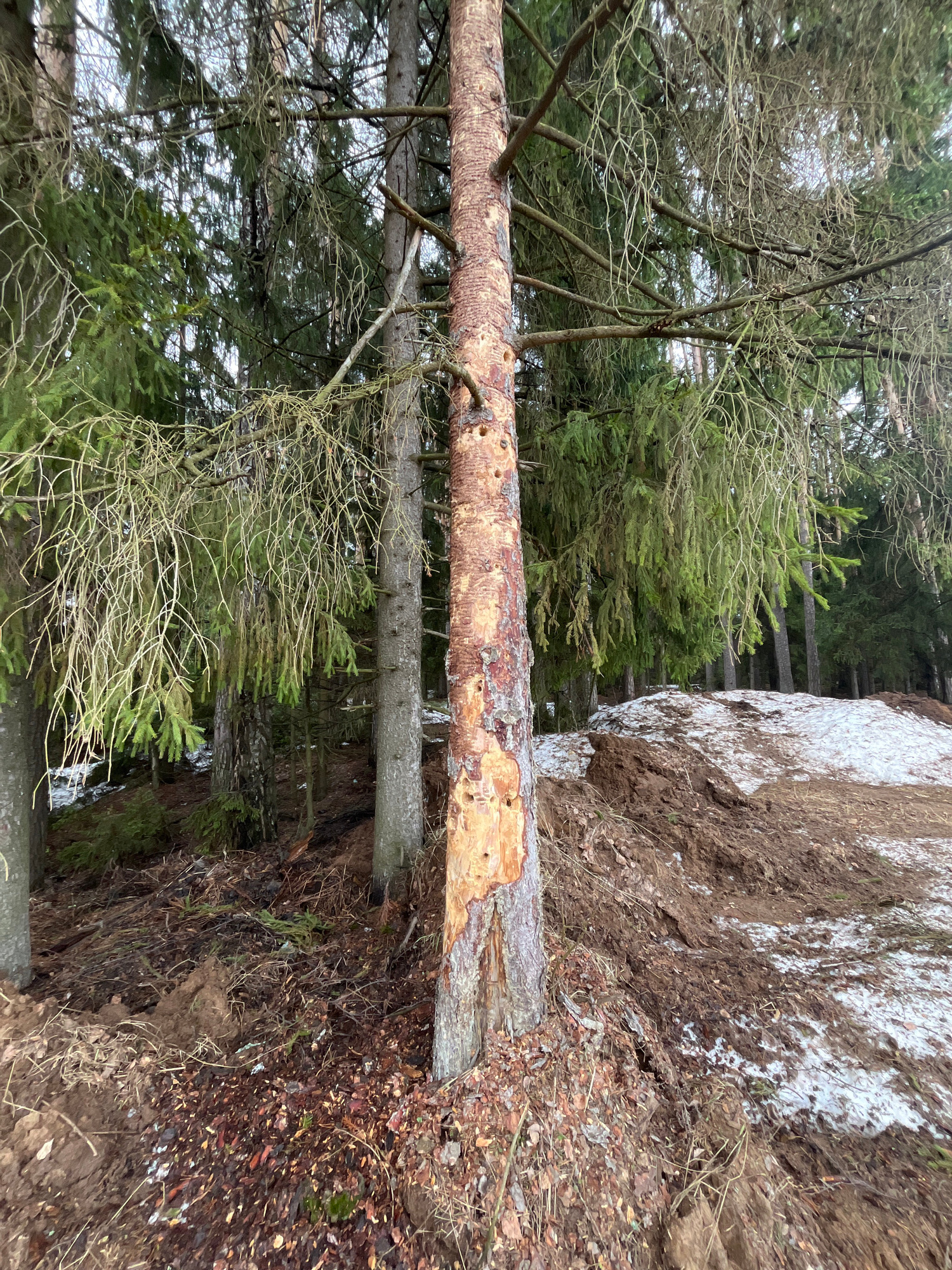 The image depicts a forest scene, likely taken outdoors. A fallen tree trunk is prominent in the foreground, showing signs of bark damage, possibly caused by woodpeckers or other animals. The trunk is…read more