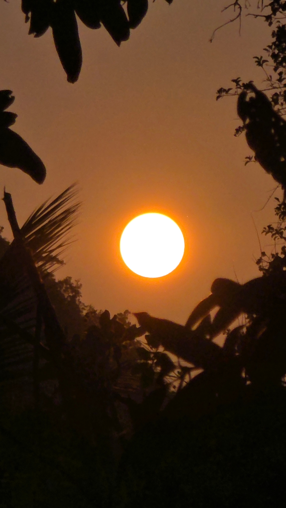 Captured from within Bac Natural Heritage Area Trang, Vietnam, the image frames a bright sun centered in the sky, with the surrounding sky taking on an orange hue. Dark silhouettes of foliage border t…read more