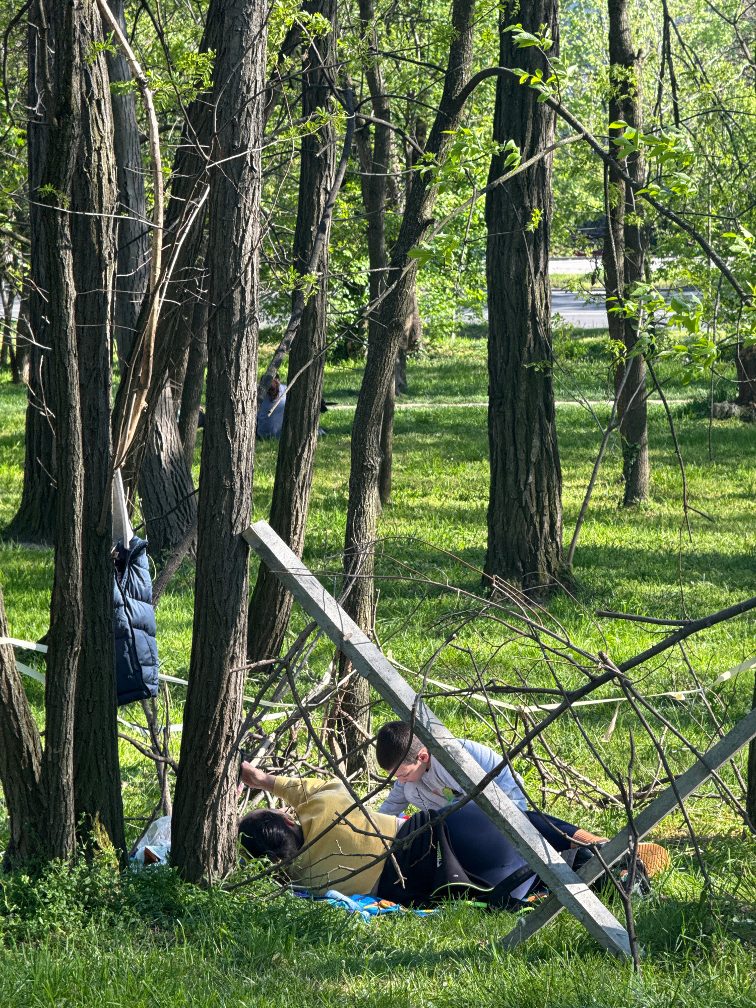 The image captures an outdoor scene in what appears to be a dense green area within Vozdovac Urban Municipality, Serbia. The setting is dominated by numerous tree trunks and branches, with vibrant gre…read more