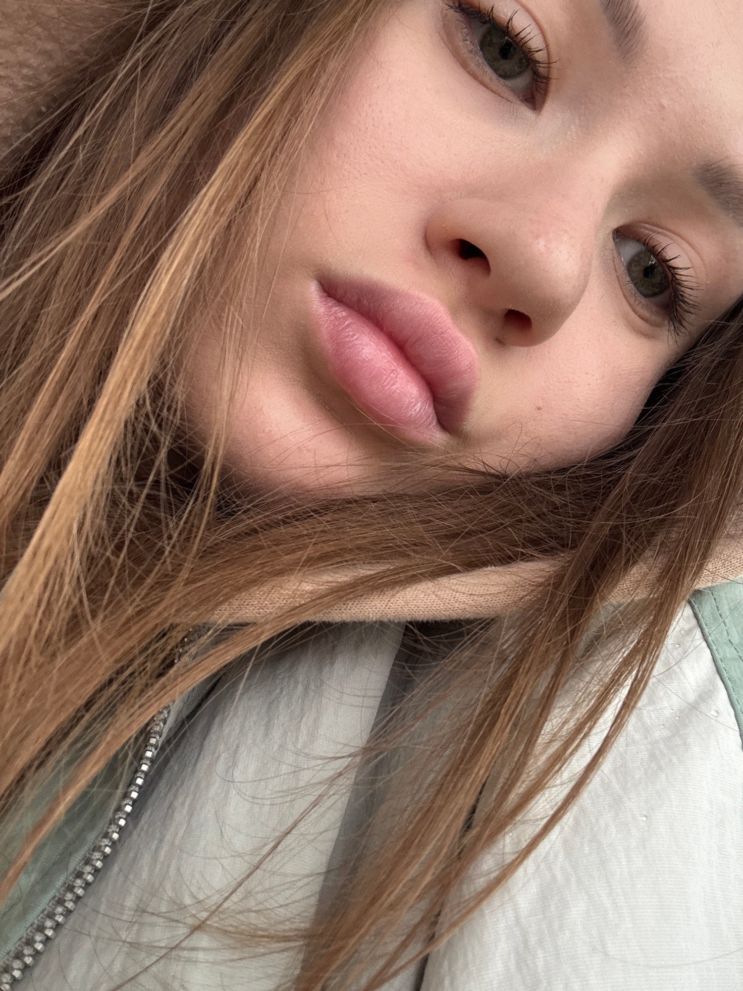 A close-up photograph features the face of a young woman with light brown hair. Her skin is fair, with subtle blemishes on her cheek. Her eyes are hazel and are lined with dark mascara. Her lips are f…read more