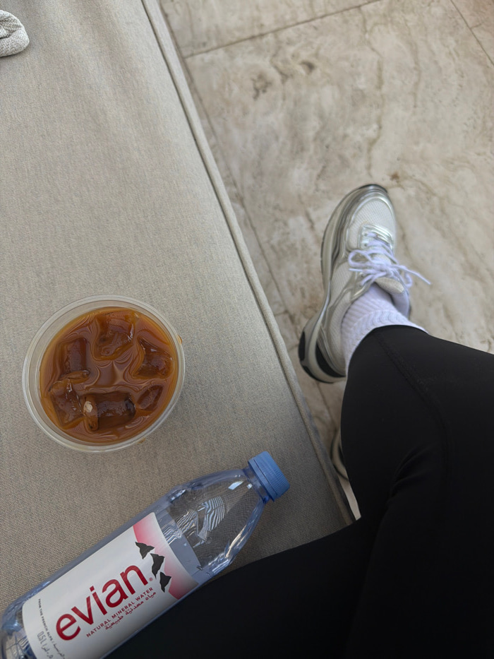 An overhead view captures the lower right leg of an individual, clad in black athletic leggings, a white ribbed sock, and a white and silver athletic shoe. Adjacent to the leg, on a light beige fabric…read more