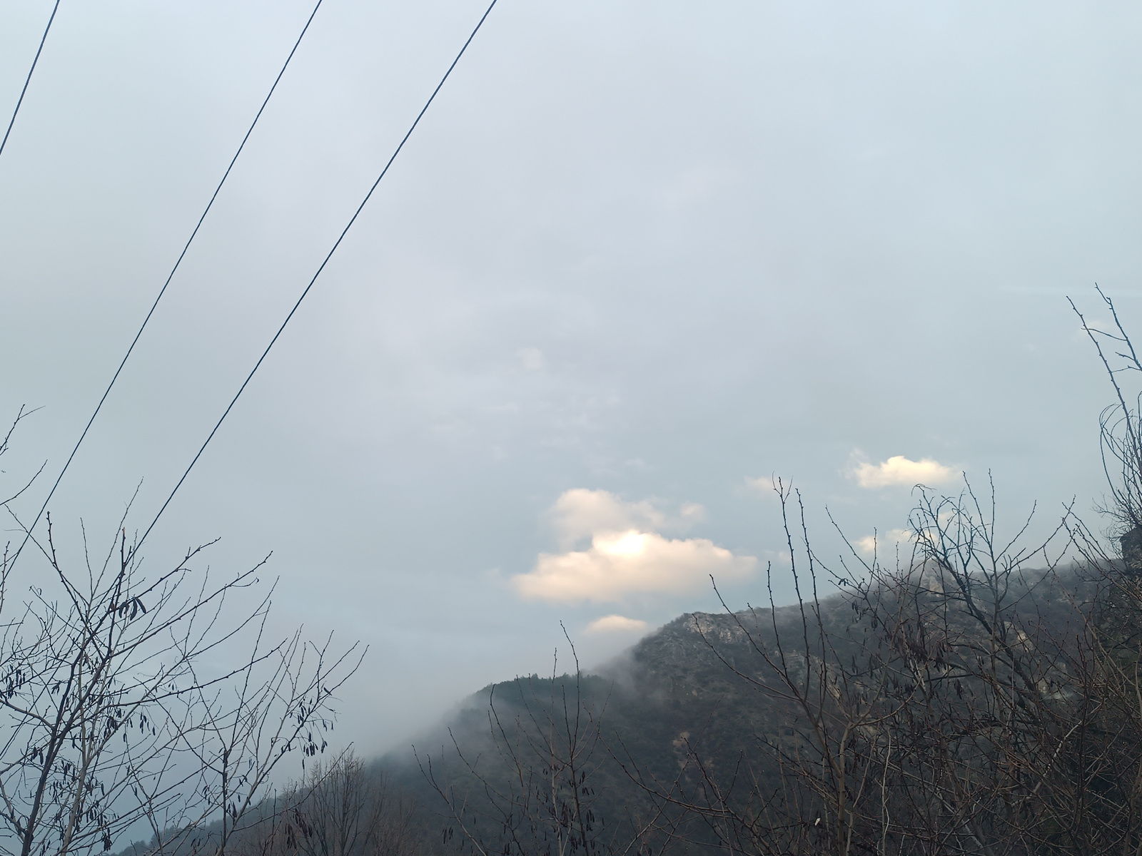 The image depicts a mountainous landscape with power lines in the upper left. Bare trees are visible in the foreground. The mountains are partially obscured by fog or clouds. Some clouds are present i…read more